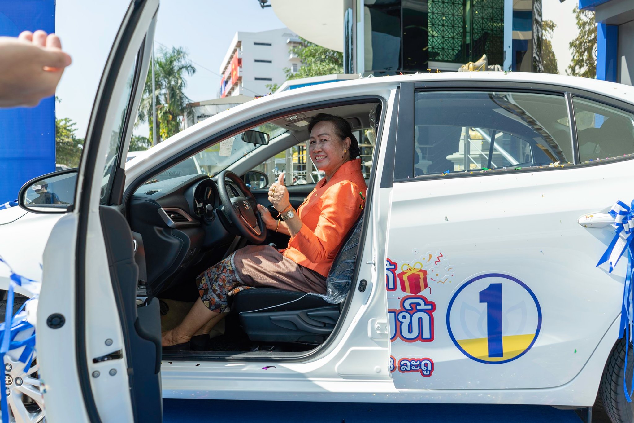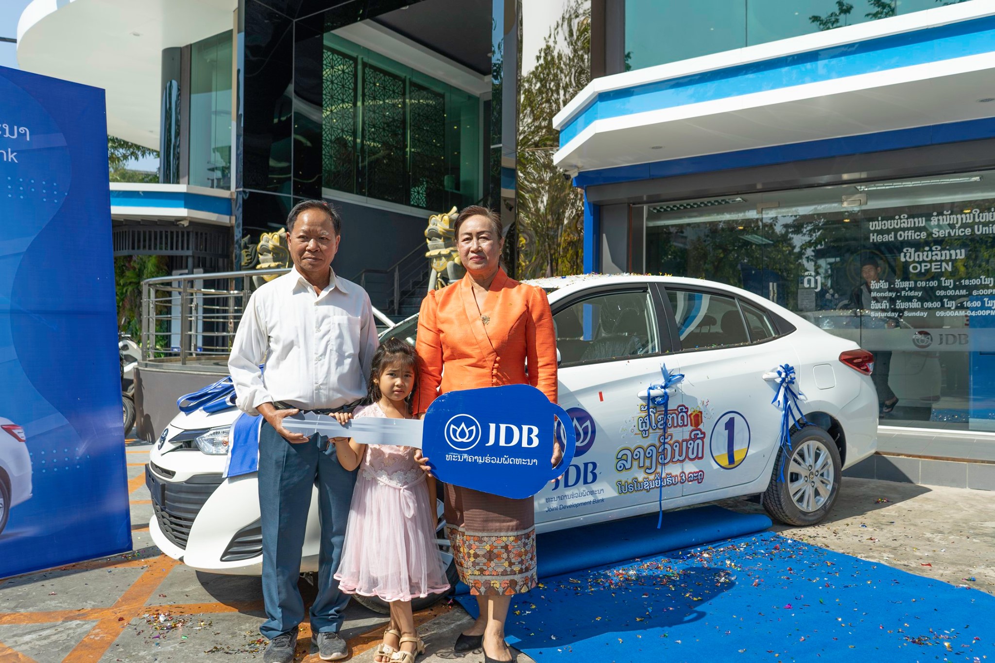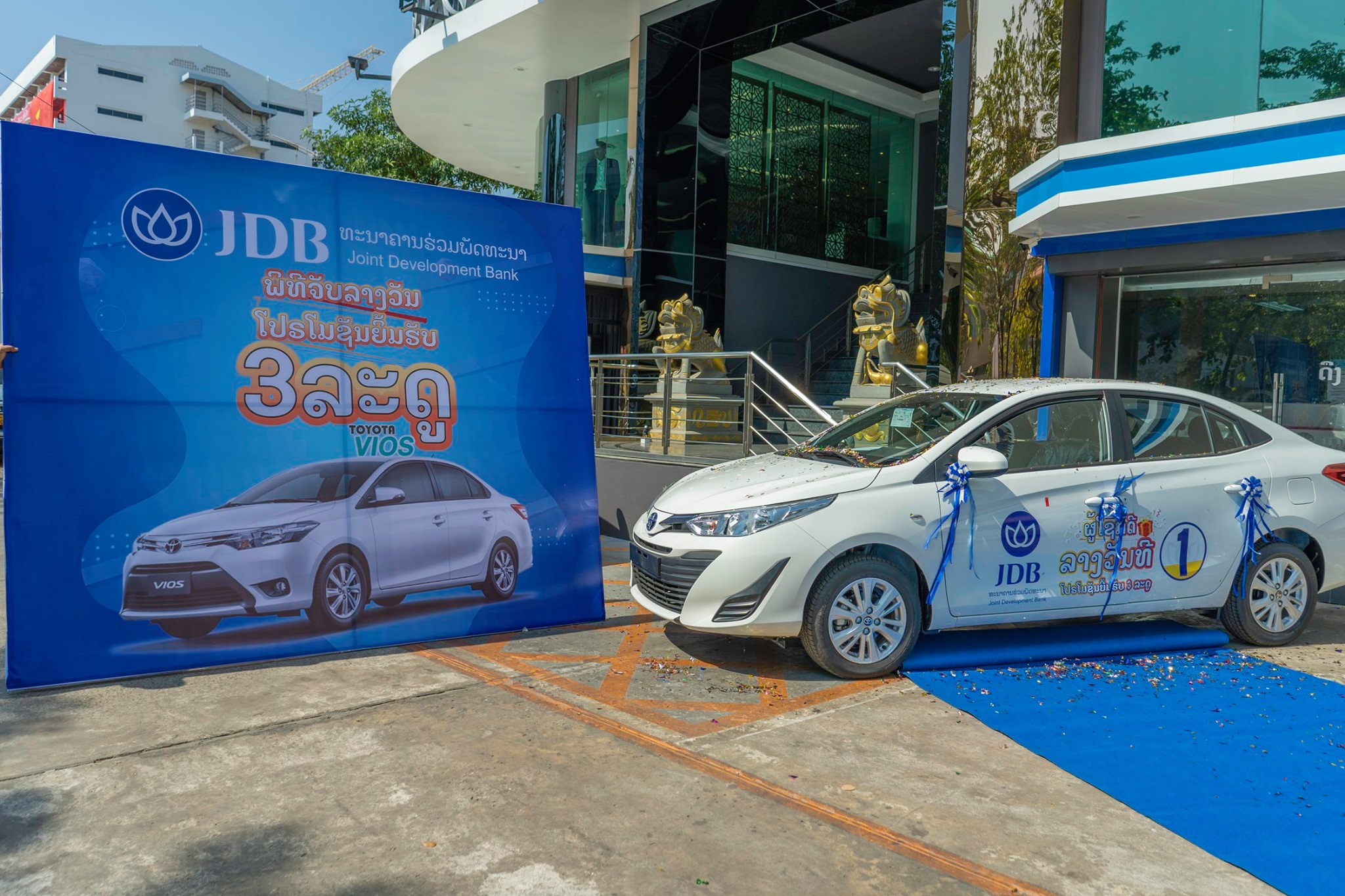 ໃນພິທີໄດ້ມີການມອບລາງວັນລົດເກງ TOYOTA VIOS ໃຫ້ຜູ້ໂຊກດີທີ່ເຂົ້າຮ່ວມໂຄງການໂປໂມຊັນຍິ້ມຮັບສາມລະດູຂອງທະນາຄານຮ່ວມພັດທະນາໃນທົ່ວປະເທດ, ຜູ້ໂຊກດີທີ່ໄດ້ຮັບລາງວັນແມ່ນ ທ່ານນາງ ຄໍາແສງ ວິລະພັນ ບ້ານໜອງທາເໜືອ ຈັນທະບູລີ ນະຄອນຫຼວງວຽງຈັນ ໂທລະສັບ 020 99577781 ທັງນີ້ກໍເພື່ອເປັນການສົ່ງເສີມການນໍາໃຊ້ທຸກຜະລິດຕະພັນຂອງທະນາຄານຮ່ວມພັດທະນາໃຫ້ຫຼາຍຂຶ້ນ ແລະເພື່ອເປັນການຄືນກຳໄລໃຫ້ລູກຄ້າທີ່ມານໍາໃຊ້ບໍລິການຜະລິດຕະພັນຂອງທະ ນາຄານຮ່ວມພັດທະນາ ຊຶ່ງທ່ານ ວິໄລ ສິພະພອນ ໄດ້ຕາງໜ້າກ່າວມອບລົດໃຫ້ລູກຄ້າທີ່ໂຊກດີໃນຄັ້ງນີ້.