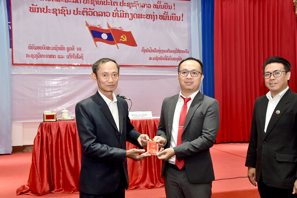 ອີງຕາມມະຕິຕົກລົງຂອງກົມການເມືອງສູນກາງພັກວ່າດ້ວຍການອອກບັດ ແລະມອບບັດໃຫ້ສະມາຊິກພັກສົມບູນຂອງພັກປະຊາຊົນປະຕິວັດລາວຕາມການສະເໜີຂອງບັນດາໜ່ວຍພັກໃນກະຊວງວິທະຍາສາດ ແລະ ເຕັກໂນໂລຊີກ່ຽວກັບການຂໍອອກບັດສະມາຊິກພັກໃຫ້ສະມາຊິກພັກສົມບູນ ຊຸດທີ VII ແລະອີງຕາມການຕົກລົງເຫັນດີຂອງຄະນະພັກກະຊວງວິທະຍາສາດ ແລະເຕັກໂນໂລຊີການມອບບັດສະມາຊິກພັກຊຸດທີ VII ມີຜູ້ໄດ້ຮັບບັດສະມາຊິກພັກສົມບູນທັງໝົດ 60 ສະຫາຍ, ຍິງ 30 ສະ ຫາຍ ໃນໂອກາດດຽວກັນນີ້ສະຫາຍຮອງເລຂາຄະນະພັກກໍໄດ້ໃຫ້ກຽດໂອ້ລົມຕໍ່ສະມາຊິກພັກສົມບູນເພື່ອໃຫ້ທິດຊີ້ນໍາກ່ຽວກັບວຽກງານພັກໃຫ້ແກ່ສະມາຊິກພັກສົມບູນ ຊຸດທີVII ເພື່ອນຳໄປຈັດຕັ້ງຜັນຂະຫຍາຍເຂົ້າໃນວຽກງານວິຊາສະເພາະຂອງຕົນໃຫ້ປາກົດຜົນເປັນຈິງ.