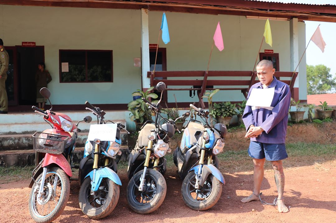 ຜ່ານການສືບສວນ-ສອບສວນຂອງ ເຈົ້າໜ້າທີ່ ທ້າວ ເລ້ ໄດ້ໃຫ້ການຮັບສາລະພາບວ່າ: ໃນເດືອນມິຖຸນາ-ກໍລະກົດ 2019 ຜູ້ກ່ຽວແມ່ນໄດ້ລົງມືລັກຊັບປະເພດລົດຈັກ ຈໍານວນ 5 ຄັນ ໃນນີ້ມີລົດຊູເມີເອັກ ຈໍານວນ 3 ຄັນ ຢູ່ຂອບເຂດໂຮງຮຽນສ້າງຄູບ້ານເກີນ ເມືອງທຸລະຄົມ ແຂວງວຽງຈັນ, ບ້ານນາຄວາຍ ເມືອງໄຊເສດຖາ ນະຄອນ ຫຼວງວຽງຈັນ, ບ້ານພະຂາວ ເມືອງໄຊທານີນະຄອນຫຼວງວຽງຈັນ ແລະລົດຈັກເວັບຮ້ອຍຈໍານວນ 2 ຄັນລັກ ຢູ່ຂອບເຂດທາງແບ່ງ ເມືອງໂພນໂຮງ ແລະ ຢູ່ເຂດຕັດໃໝ່ຂອບເຂດ ບ້ານໂພນໝີ ເມືອງວຽງຄໍາ ແຂວງວຽງຈັນ ສ່ວນວິທີລັກລົດແຕ່ລະຄັ້ງແມ່ນຜູ້ກ່ຽວໄດ້ຂີ່ລົດໂດຍສານໄປເມື່ອສັງເກດເຫັນລົດຈັກຈອດຢູ່ແຄມມທາງຜູ້ກ່ຽວກໍ່ລົງລົດໂດຍສານສັງເກດເບິ່ງບໍ່ເຫັນເຈົ້າຂອງລົດຜູ້ກ່ຽວຈຶ່ງລົງມືລັກໂດຍໃຊ້ກະແຈໂຕເຕ້ງັດເມື່ອໄດ້ລົດມາແລ້ວກໍ່ເອົາໄປຂາຍໃຫ້ປະຊາຊົນບ້ານໄກ້ຄຽງໃນລາຄາ 2,5 ລ້ານກີບ ຫາ 4,5 ລ້ານກີບ.