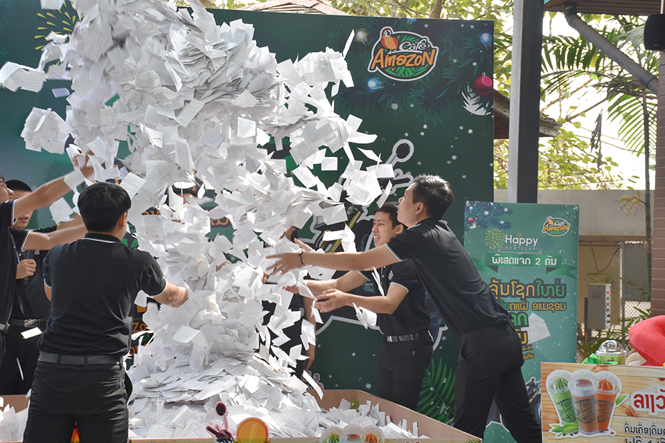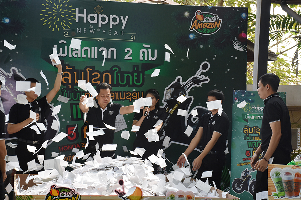 ທ່ານ ມົນໄຊ ບຸນອີ່ມ ກ່າວວ່າ: ການຈັບລາງວັນຄັ້ງນີ້ກໍເພື່ອເປັນການຄືນກໍາໄລໃຫ້ແກ່ລູກຄ້າຜູ້ໂຊກດີສົ່ງທ້າຍປີ ເພື່ອມອບເປັນຂອງຂວັນເປັນການຂອບໃຈລູກຄ້າທີ່ເຊື່ອ ໝັ້ນ ແລະເຂົ້າມາໃຊ້ບໍລິການຕະຫຼອດມາ ແລະຫວັງວ່າຄາເຟ່ອາເມຊອນຈະຍັງຢູ່ໃນໃຈລູກຄ້າແບບນີ້ຕະຫຼອດໄປ; ສໍາລັບການຈັບລາງວັນໃນຄັ້ງນີ້ລວມມີ 3 ປະເພດຄື: ລາງວັນລົດຈັກ Honda Zoomer-X ຈໍານວນ 2 ຄັນ, ລາງວັນດື່ມເຄື່ອງດື່ມລ້າ 1 ເດືອນ 3 ລາງວັນ ແລະລາງວັນຂອງທີ່ລະລຶກ 5 ລາງວັນ.