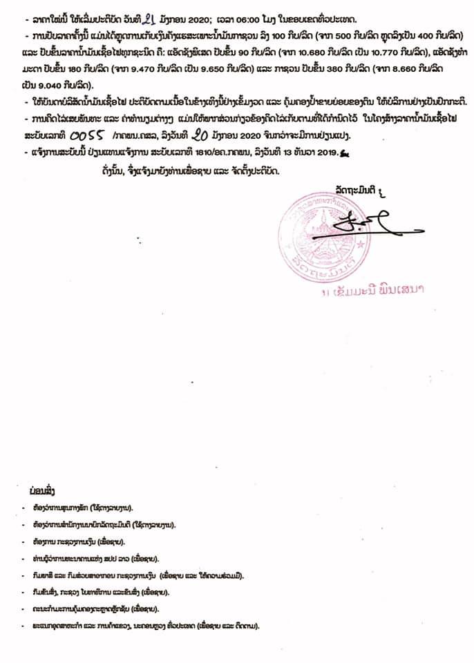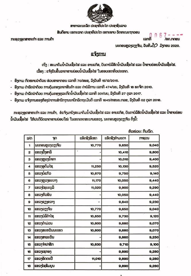 ກະຊວງອຸດສາຫະກໍາ ແລະການຄ້າອອກແຈ້ງການສະບັບເລກທີ 0067/ອຄ.ກຄພນ, ລົງວັນທີ 20 ມັງກອນ 2020, ເຖິງສະມາຄົມນໍ້າມັນເຊື້ອໄຟ ແລະອາຍແກັສ, ບັນດາບໍລິສັດນໍ້າມັນເຊື້ອໄຟ ແລະປໍ້າຂາຍຍ່ອຍນໍ້າມັນເຊື້ອໄຟໃຫ້ປັບຂຶ້ນລາຄາຂາຍຍ່ອຍນໍ້າມັນເຊື້ອໄຟໃນຂອບເຂດທົ່ວປະເທດ.