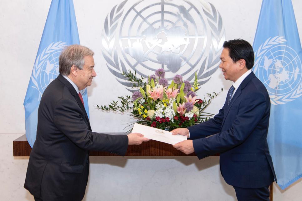 ໃນໂອກາດດັ່ງກ່າວ, ພະນະທ່ານ ເລຂາທິການໃຫຍ່ ໄດ້ສະແດງຄວາມຍິນດີຕ້ອນຮັບ ແລະ ຊົມເຊີຍ ທ່ານເອກອັກຄະລັດຖະທູດ ທີ່ໄດ້ຖືກແຕ່ງຕັ້ງມາດຳລົງແໜ່ງ ເປັນຜູ້ຕາງໜ້າຖາວອນ ແຫ່ງ ສປປ ລາວ ປະຈຳອົງການ ສປຊ, ພ້ອມທັງຊົມເຊີຍ ລັດຖະບານ ແຫ່ງ ສປປ ລາວ ທີ່ໄດ້ມີຄວາມຄືບຫນ້າໃຫ້ການພັດທະນາປະເທດ, ສາມາດຜ່ານຜ່າຄວາມຫຍຸ້ງຍາກໃນອາດີດ ແລະ ມີຄວາມໝາຍໝັ້ນໃນການຫຼຸດພົ້ນອອກຈາກສະຖານະພາບປະເທດທີ່ດ້ອຍພັດທະນາ ພ້ອມກັນນັ້ນ, ພະນະທ່ານ ເລຂາທິການໃຫຍ່ ຍັງໃຫ້ຄຳໝັ້ນສັນຍາວ່າ ອົງການ ສປຊ ຈະສືບຕໍ່ໃຫ້ການສະໜັບສະໜູນຊ່ວຍເຫລືອ ສປປ ລາວ ໃນການຈັດຕັ້ງເປົ້າໝາຍການພັດທະນາແບບຍືນຍົງ ແລະ ຍັງໄດ້ກ່າວເຖິງທ່າແຮງທາງດ້ານທຳມະຊາດ ແລະ ວັດທະນາທຳອັນດີງາມ ທີ່ຄັ້ງຫນຶ່ງໃນຫລາຍປີຜ່ານມາພະນະທ່ານເລຂາທິການໃຫຍ່ໄດ້ມີໂອກາດສຳພັດ ແລະ ມີຄວາມປະທັບໃຈຈາກການເດີນ ທາງທ່ອງທ່ຽວແຕ່ຊາຍແດນສາມຫຼ່ຽມຄຳ ຈົນຮອດສີ່ພັນດອນ.