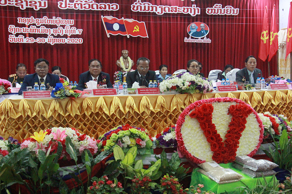 ສະຫາຍ ບຸນນາວ ຈັນດອນ ໄດ້ ກ່າວໄຂກອງປະຊຸມຢ່າງເປັນທາງ ການ ພ້ອມທັງຜ່ານຮ່າງລາຍງານ ການເມືອງທັງສອງພາກຊຶ່ງໄດ້ທົບທວນ ແລະຕີລາຄາຄືນການ ຈັດຕັ້ງປະຕິບັດມະຕິກອງປະຊຸມ ໃຫຍ່ ຄັ້ງທີ IV ໂດຍຍົກໃຫ້ເຫັນ ເຖິງຜົນສຳເລັດ, ຂໍ້ຄົງຄ້າງ ແລະ ບົດຮຽນທີ່ຖອດຖອນໄດ້ຈາກການ ປະຕິບັດໜ້າວຽກຕົວຈິງ, ພ້ອມທັງໄດ້ກໍານົດທິດທາງ ແລະຄາດໝາຍສູ້ຊົນ 5 ປີຕໍ່ໜ້າ (2019-2024), ໄລຍະຜ່ານມາທົ່ວເມືອງຍັງມີສະຖຽນລະພາບທາງດ້ານການເມືອງ, ສັງຄົມມີຄວາມສະຫງົບ ໂດຍພື້ນຖານ, ເສດຖະກິດໄດ້ຮັບ ການຂະຫຍາຍຕົວຢ່າງຕໍ່ເນື່ອງ ເພີ່ມຂຶ້ນອັດຕາເສດຖະກິດສະເລ່ຍ ໃນລະດັບ7,2% ຕໍ່ປີ, ຂະແໜງ ກະສິກຳ-ປ່າໄມ້ ບັນລຸໄດ້ 81,309 ລ້ານກີບ ກວມເອົາ 35% ຂອງ (GDP), ອຸດສະຫາກຳ ບັນລຸໄດ້ 53,809ຂອງ (GDP), ບໍລິການບັນລຸໄດ້ 98,352 ລ້ານກີບ ກວມເອົາ 42% ຂອງ (GDP), ສະເລ່ຍລາຍຮັບຕໍ່ຫົວຄົນບັນລຸໄດ້ 454 ໂດລາຕໍ່ຄົນຕໍ່ປີ, ທຽບໃສ່ປີ 2014 ເຫັນໄດ້ວ່າຊີວິດການເປັນຢູ່ຂອງປະຊາ ຊົນດີຂຶ້ນ ແລະທຽບ ໃສ່ແຜນການ 5 ປີປະຕິບັດໄດ້ບັນ ລຸຄາດໝາຍ, ປີ 2015 ອີງໃສ່ການ ປະເມີນຄອບຄົວໝົດ 2.636 ຄອບ ຄົວ ໃນນັ້ນ ຄອບຄົວທຸກຍາກ 429 ຄອບຄົວ ກວມເອົາ 16,27%, ປີ 2019 ຈຳນວນຄອບຄົວເພິ່ມຂຶ້ນ 3.086 ຄອບຄົວ ໃນນັ້ນຈຳນວນ ຄອບຄົວພັດທະນາ 2.254 ຄອບຄົວກວມເອົາ 73% ຂອງຈຳນວນຄອບຄົວທັງໝົດພ້ອມນີ້ຍັງມີດ້ານວຽກງານອື່ນໆ.
