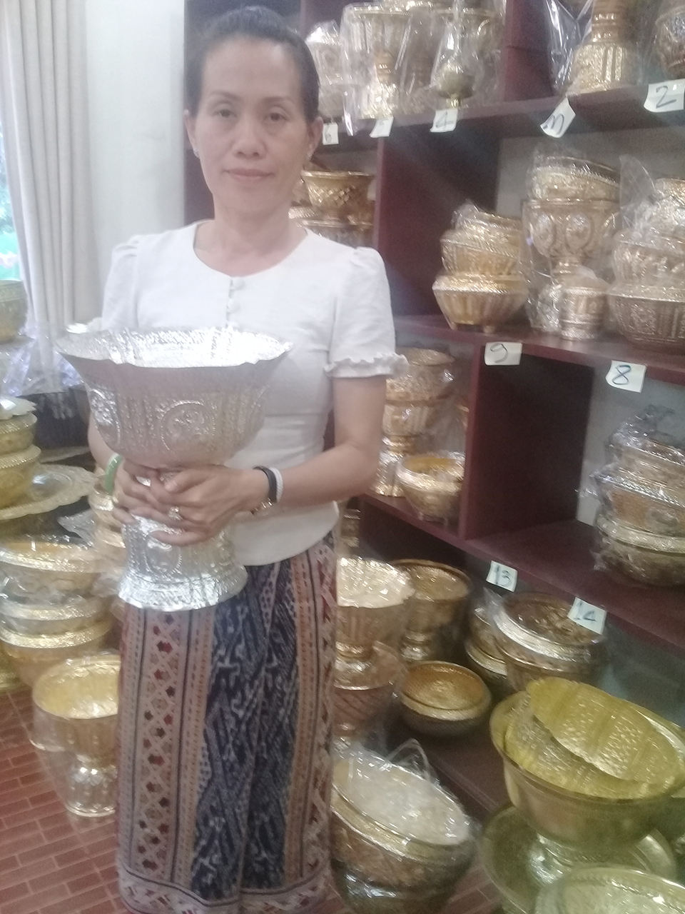 ຄອບຄົວ ນາງ ໄພວັນ ກິນນະວົງ ກໍແມ່ນອີກຄອບຄົວໜຶ່ງທີ່ມີອາຊີບຫັດຖະກໍາຕີໂອ-ຕີຂັນຄວັດລິງ ຄວັດລາຍ,ປະຈຸບັນຢູ່ບ້ານວຽງສະຫວັນ ເມືອງສີໂຄດຕະບອງ, ນະຄອນຫຼວງວຽງຈັນ, ໂດຍຜູ້ ກ່ຽວໄດ້ໃຫ້ຮູ້ວ່າ, ເບື້ອງຕົ້ນແມ່ນ ມີອາຊີບຕີເງິນ-ຕີຄໍາ ເຮັດສາຍ ແຂນ-ສາຍຄໍ ແລະເຄື່ອງປະດັບ ທົ່ວໄປ, ແຕ່ພໍມາຮອດໄລຍະໜຶ່ງ ເຫັນວ່າການເຮັດອາຊີບນີ້ບໍ່ໄດ້ດີ ພໍປານໃດເກີດມີສະພາບຝືດເຄືອງ ຫຼາຍດ້ານການຕະຫຼາດຈຶ່ງໄດ້ຢຸດຕິ ແລະຫັນມາປະກອບອາຊີບຕີ ໂອ-ຕີຂັນແທນ, ໂດຍເຮັດຢູ່ໃນວົງ ແຄບແບບຄອບຄົວມີແຕ່ຜົວ-ເມຍ ຊ່ວຍກັນເຮັດ ໄດ້ມື້ລະເລັກລະໜ້ອຍ ແລ້ວກໍເອົາໄປສົ່ງຂາຍທີ່ຕະຫຼາດເຊົ້າ, ອາຊີບດັ່ງກ່າວກໍໄດ້ດໍາເນີນ ໄປເລື້ອຍໆແບບໜັກເອົາເບົາສູ້ ແລະບໍ່ຍອມທໍ້ຖອຍ ເຫັນວ່າທຸລະກິດນີ້ດໍາເນີນໄປໄດ້ດີ ແລະມັນ ເປັນອາຊີບທີ່ເໝາະສໍາລັບຄອບຄົວຂອງຕົນເອງ, ຈາກນັ້ນ ຈຶ່ງໄດ້ ເລີ່ມຂະຫຍາຍທຸລະກິດນີ້ອອກສູ່ວົງກວ້າງ ດ້ວຍການລົງທຶນເພີ່ມ ໃນການຊື້ວັດຖຸດິບມາຜະລິດ ແລະ ເພີ່ມແຮງງານຕື່ມອີກ, ຊຶ່ງມາຮອດປະຈຸບັນມີຊ່າງຈອດ-ຊ່າງ ຍ້ອມຢູ່ກິນນໍາປະຈໍາ 4 ຄົນ ແລະ ມີຊ່າງຕີລິງຕີລາຍເກືອບ 20 ຄອບ ຄົວ ແລ້ວບໍ່ມີເງິນເດືອນແຕ່ກິນຕາມຜະລິດຕະພັນ.