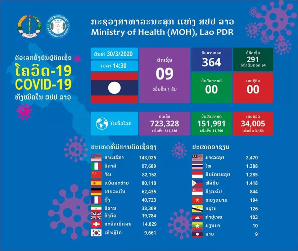 ສປປ ລາວ ກວດພົບຜູ້ຕິດເຊື້ອໂຄວິດ-19 ໃນວັນທີ 24 ມີນາ ມາຮອດວັນທີ 30 ມີນາ ລວມຕົວເລກຜູ້ຕິດເຊື້ອແລ້ວຈຳນວນ 9 ກໍລະນີ ຢູ່ນະຄອນຫຼວງ 6 ກໍລະນີ ແລະຢູ່ແຂວງຫຼວງພະບາງ 3 ກໍລະນີ ຈາກຈຳນວນທີ່ໄດ້ກວດວິເຄາະກໍລະນີສົງໄສທັງໝົດມີ 364 ກໍລະນີ.