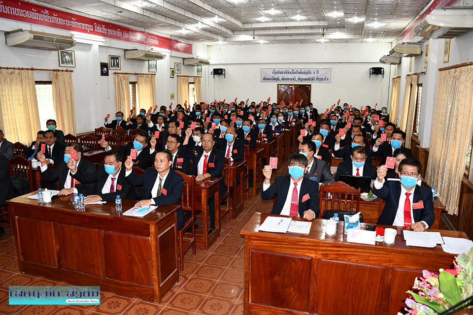 ກອງປະຊຸມຍັງໄດ້ເປັນເອກະສັນປະຊາມະຕິປ່ອນບັດເລືອກຕັ້ງເອົາຄະນະພັກຊຸດໃໝ່ຊຶ່ງມີຜູ້ສະໝັກ 11 ສະຫາຍ ຍິງ 1 ສະຫາຍ ເລືອກເອົາ 9 ສະຫາຍ ກອງປະ ຊຸມຄັ້ງປະຖົມມະລຶກເຫັນດີເລືອກເອົາສະຫາຍ ຄໍາເພັດ ພົມມະລາດ ເປັນເລຂາຄະນະພັກຮາກຖານ, ສະຫາຍ ບຸນມາ ບຸນຊູຮັກ ເປັນຮອງເລຂາຄະນະພັກຮາກຖານທັງເປັນປະທານກວດກາຄະນະພັກຮາກຖານ, ພ້ອມເລືອກເອົາຄະນະພັກຮາກຖານຕື່ມອີກ 7 ສະຫາຍ, ກອງປະຊຸມຍັງໄດ້ປ່ອນບັດເລືອກເອົາຜູ້ແທນສົມບູນ, ສໍາຮອງໄປຮ່ວມກອງປະຊຸມໃຫຍ່ຄັ້ງທີ VII ອົງ ຄະນະພັກແຂວງໄຊຍະບູລີ, ມີຜູ້ສະໝັກ 8 ສະຫາຍ ຍິງ 1 ສະຫາຍ ເລືອກເອົາ 5 ສະຫາຍ ແລະສໍາ ຮອງ 1 ສະຫາຍ.
