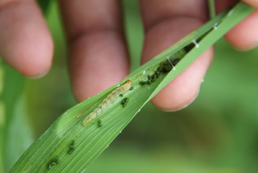 ສ່ວນບົ້ງຕົ້ນເຂົ້າ: ເປັນສັດຕູເຂົ້າທີ່ພົບໄດ້ທຸກສະພາບແວດລ້ອມ, ບົ້ງຕົ້ນເຂົ້າມັກທຳລາຍຕົ້ນເຂົ້າເມື່ອອາຍຸໄດ້ 30-50 ວັນ, ມັນຈະວາງໄຂ ແລະຝັກເປັນບົ້ງທໍາລາຍກາບໃບເຮັດໃຫ້ກາບໃບເຂົ້າມີສີເຫຼືອງ ຫຼືສີນໍ້າຕານຊຶ່ງຈະເຫັນເປັນອາການຊໍ້າໆ ໂດຍສະເພາະຈະມັກພົບເຫັນໃນໄລຍະປັກດຳແລ້ວປະມານ 1 ເດືອນ ເມື່ອຕົ້ນເຂົ້າໃຫຍ່ຂຶ້ນບົ້ງກໍຈະກັດກິນຕົ້ນເຂົ້າເຮັດໃຫ້ເກີດອາການໃບຫ້ຽນໃນໄລຍະທຳອິດ, ໃບ ແລະຍອດທີ່ຖືກທຳລາຍຈະເຫຼືອງໃນໄລຍະຕໍ່ມາ, ການປ້ອງກັນ ແລະກຳຈັດ, ກ່ອນຈະປູກເຂົ້າຄວນກຳຈັດໄຮ່ນາໂດຍການໄຖເພື່ອກຳຈັດທີ່ຢູ່ອາໄສຂອງແມງໄມ້, ບໍ່ຄວນຫວ່ານເຂົ້າ ຫຼື ປັກດຳເຂົ້າຖີ່ເກີນໄປ, ໃຊ້ຢາໄພຣິຟໍ 20% ໃນອັດຕາ 80 ມິລີລິດຕໍ່ນໍ້າ 20 ລິດ ຫຼືຄາໂບຊັນແຟນ 20% ອັດຕາ 81 ມິລີລິດຕໍ່ນໍ້າ 20 ລິດ ພົ່ນໃຫ້ທົ່ວທົ່ງນາພຽງຄັ້ງດຽວ.