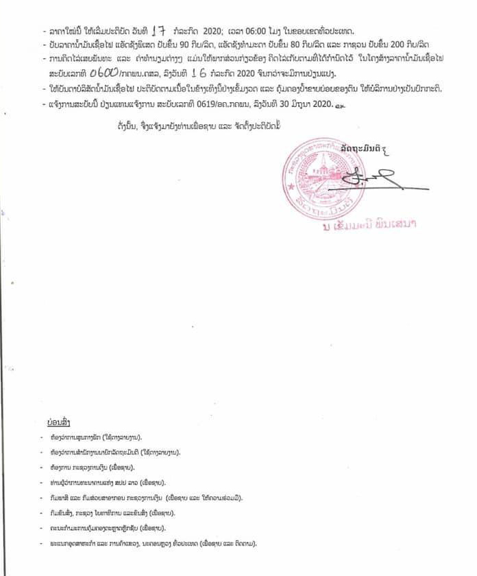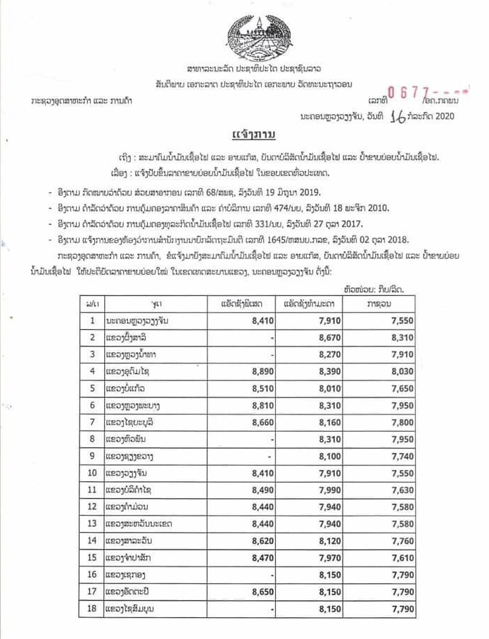 ກະຊວງອຸດສາຫະກຳ ແລະການຄ້າອອກແຈ້ງການ ເລກທີ 0677/ອຄ.ກຄພນ ລົງວັນທີ 16 ກໍລະກົດ 2020 ແຈ້ງການປັບຂຶ້ນລາຄານໍ້າມັນເຊື້ອໄຟທົ່ວປະເທດ ເລີ່ມປະຕິບັດເຊົ້າວັນທີ 17 ກໍລະກົດນີ້ ເວລາ 6:00 ໂມງ ເປັນຕົ້ນໄປ.