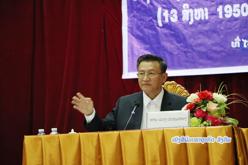 ທ່ານ ແດງ ປະທຸມທອງ ຮອງເຈົ້າແຂວງໄດ້ຫວນຄືນມູນເຊື້ອການກຳເນີດເຕີບໃຫຍ່ຂະຫຍາຍຕົວຂອງແນວລາວສ້າງຊາດໂດຍຜ່ານສາມໄລຍະປະຫວັດສາດຄື: ໄລຍະແນວລາວອິດສະຫຼະແມ່ນໄລຍະທີ່ສ້າງເງື່ອນໄຂ ແລະກະກຽມທຸກດ້ານເພື່ອສ້າງຕັ້ງພັກປະຊາຊົນລາວ ແລະແນວລາວອິດສະຫຼະໄດ້ຕາງໜ້າພັກແບກຫາບພາລະກິດທຸກດ້ານ, ນຳພາປະຊາຊົນລາວບັນດາເຜົ່າຕໍ່ສູ້ເອົາຊະນະຈັກກະພັດລ່າເມືອງຂຶ້ນແບບເກົ່າ; ໄລຍະແນວລາວຮັກຊາດໄລຍະນີ້ຄະນະກຳມະການແນວລາວຮັກຊາດເຮັດວຽກ ງານເຕົ້າໂຮມ, ທັງເຮັດວຽກຄຸ້ມຄອງບັນຊາທຸກວຽກງານຂອງກຳລັງຮັກຊາດໄດ້ຕາງໜ້າພັກອອກເຄື່ອນໄຫວເປີດເຜີຍເພື່ອຕໍ່ສູ້ຕ້ານຈັກກະພັດ ແລະລູກມືຂາຍຊາດທາງດ້ານການເມືອງ,ການທະຫານ, ການຕ່າງປະເທດປຸກລະດົມຂົນຂວາຍມະຫາຊົນກໍ່ຄືປະຊາຊົນບັນດາເຜົ່າເຂົ້າຮ່ວມສ້າງພື້ນຖານ ແລະສ້າງກຳລັງປະຕິວັດຊຶ່ງໄດ້ສ້າງທ່ວ ທ່າ ແລະ ບາດກ້າວໃໝ່ໃຫ້ແກ່ຂະບວນການປະຕິວັດອັນເປັນປັດໄຈທີ່ໜັກແໜ້ນໃຫ້ແກ່ການຕໍ່ສູ້ຢີດເຍື້ອຍາວນານຂອງປະຊາຊົນລາວຈາກບ່ອນກຳລັງປະຕິວັດຍັງອ່ອນນ້ອຍໄປເຖິງບ່ອນມີຮາກຖານການເມືອງຢູ່ທຸກທ້ອງຖິ່ນ,ເອົາໜ້ອຍຕີຫຼາຍເອົາອາວຸດລ້າສະໃໝຕີກັບອາວຸດທີ່ທັນສະໃໝສາມາດຕີເອົາໄຊຊະນະຈັກກະພັດທີ່ໃຫຍ່ໂຕກວ່າໝູ່ໃນໂລກ;ໄລຍະທີສາມແມ່ນໄລຍະແນວລາວສ້າງຊາດພາຍຫຼັງປະເທດຊາດໄດ້ຮັບການປົດປ່ອຍຢ່າງສົມບູນອົງການແນວລາວສ້າງຊາດໄດ້ມີການເຕີບໃຫຍ່ຂະຫຍາຍຕົວທາງດ້ານການຈັດຕັ້ງ ແລະ ໄດ້ຮ່ວມກັບບັນດາອົງການຈັດຕັ້ງມະຫາຊົນ ແລະ ອົງການຈັດຕັ້ງສັງຄົມຕ່າງໆສືບຕໍ່ປະຕິບັດ 2 ໜ້າທີ່ຍຸດທະສາດຄື: ປົກປັກຮັກສາ ແລະສ້າງສາພັດທະນາປະເທດຊາດໃຫ້ມີຄວາມຮຸ່ງ ເຮືອງສີວິໄລ.