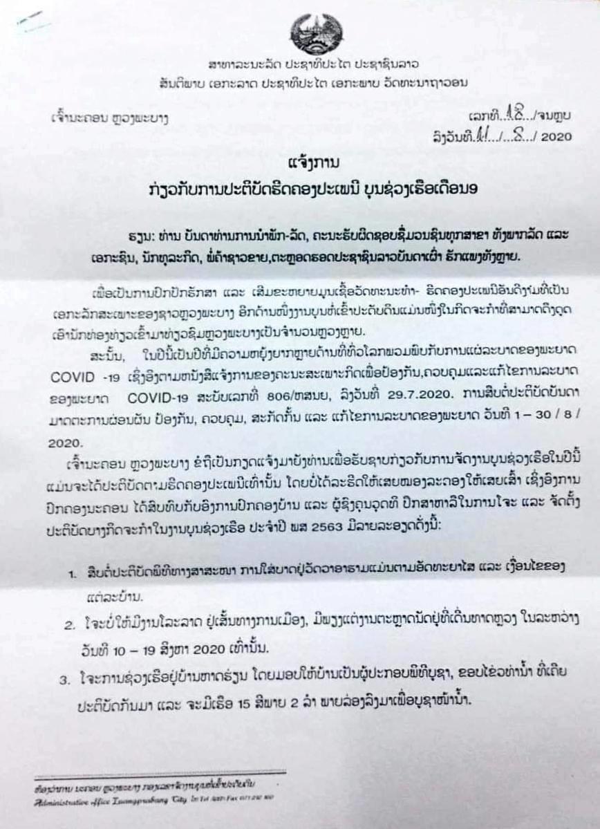 ເນື່ອງຈາກສະພາບການແຜ່ລະບາດຂອງເຊື້ອໂຄວິດ-19 ໃນທົ່ວໂລກຍັງມີຕົວເລກເພີ່ມຂຶ້ນຢ່າງຕໍ່ເນື່ອງກໍຄືບັນດາປະເທດເພື່ອນບ້ານໃກ້ຄຽງ ແລະເພື່ອປະຕິບັດຕາມຄໍາສັ່ງຂັ້ນເທິງໃນການພ້ອມກັນປ້ອງກັນການແຜ່ລະບາດຂອງເຊື້ອພະຍາດໂຄວິດ-19 ຊຶ່ງໃນປີ 2020 ນີ້ທາງນະຄອນຫຼວງພະບາງຈະບໍ່ໄດ້ຈັດໃຫ້ມີງານໂລະລາດ (ຕະ ຫຼາດນັດມວນຊົນເສັ້ນທາງກາງເມືອງ), ໂຈະງານບຸນຊ່ວງເຮືອແບບມີມວນຊົນເຂົ້າຮ່ວມເປັນຈໍານວນຫຼາຍຈະຈັດໃຫ້ເປັນພິທີຕາມຮີດຄອງປະເພນີທີ່ເຄີຍປະຕິບັດກັນຜ່ານມາ.