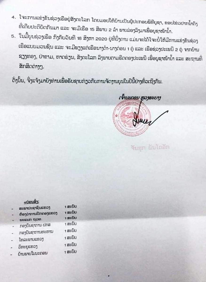 ສະນັ້ນປີນີ້ຈຶ່ງໄດ້ແຈ້ງເຖິງບັນດາຜູ້ທີ່ຈະເດີນທາງຈາກຕ່າງແຂວງກໍຄືພາຍໃນບັນດາເມືອງອ້ອມຂ້າງແຂວງທີ່ຈະເຂົ້າມາທ່ຽວຊົມຮ່ວມເຊຍງານບຸນຊ່ວງເຮືອເດືອນ 9 ຫໍ່ເຂົ້າປະດັບດິນທີ່ຍຶ່ງຄານ ນະຄອນຫຼວງພະບາງ ແຂວງຫຼວງພະບາງ ປີນີ້ຈະບໍ່ໄດ້ຈັດງານໃຫຍ່ຄືປີທີ່ຜ່ານມາຈະມີພຽງເຮັດພິທີແບບບູຊາຄອບໄຫວ້ສະຖານທີ່ເທົ່ານັ້ນສໍາລັບປີ 2020 ນີ້ທ່ານເຈົ້ານະຄອນກ່າວ.