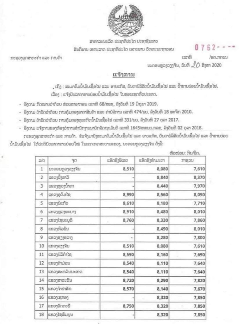 ແຈ້ງການ: ກະຊວງອຸດສາຫະກຳແລະການຄ້າໄດ້ອອກແຈ້ງການປະກາດປັບຂຶ້ນລາຄານໍ້າມັນແອັດຊັງພິເສດ ແລະແອັດຊັງທຳມະດາ, ສ່ວນນໍ້າມັນການຊວນປັບລົງ ເລີ່ມປະຕິບັດ 21 ສິງຫາ 2020.