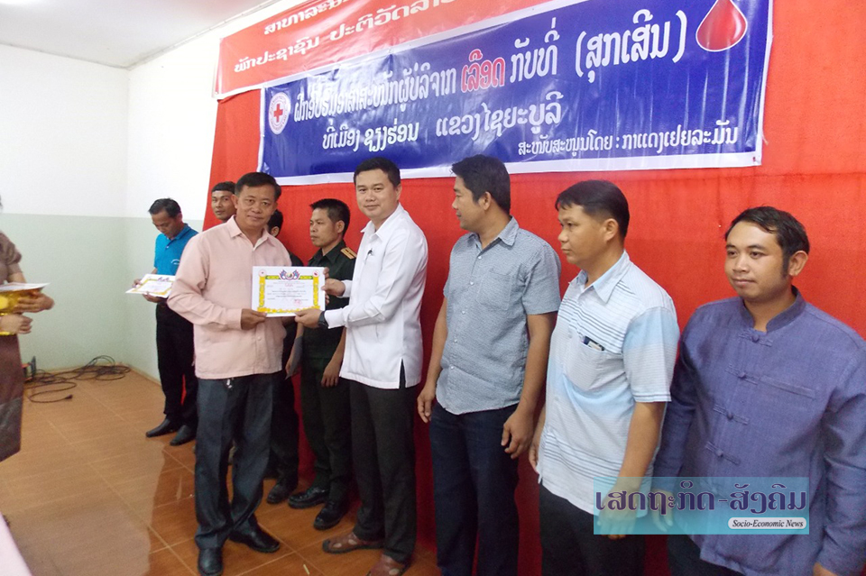 ຕອນທ້າຍຊຸດຝຶກອົບຮົມຍັງໄດ້ມອບໃບຍ້ອງຍໍຂອງທ່ານເຈົ້າເມືອງໃຫ້ບຸກຄົນທີ່ມີຜົນງານດີເດັ່ນໃນການປຸກລະດົມຈິດອາສາບໍລິຈາກເລືອດ ແລະຮັບຟັງການໂອ້ລົມຂອງທ່ານຮອງເຈົ້າເມືອງເຊິ່ງທ່ານໄດ້ເນັ້ນໜັກໃຫ້ສຳມະນາກອນຈົ່ງນຳເອົາເນື້ອໃນຈິດໃຈທີ່ໄດ້ອົບຮົມໃນຄັ້ງນີ້ໄປຈັດຕັ້ງປະຕິບັດເຜີຍແຜ່ປຸກລະດົມສັງຄົມໃຫ້ຮັບຮູ້, ເຂົ້າໃຈ ແລະກະກຽມຈິດໃຈເພື່ອປະກອບສ່ວນບໍລິຈາກເລືອດສິ່ງສຳຄັນແມ່ນສືບຕໍ່ໃຫ້ການຮ່ວມມື ແລະເພີ່ມຄວາມຮັບຜິດຊອບໃນການປຸກລະດົມການບໍລິຈາກເລືອດດ້ວຍຄວາມ ສະໝັກໃຈໃຫ້ຫຼາຍຂຶ້ນຜູ້ບໍລິຈາກເລືອດຫຼາຍເທື່ອ ຫຼືຜູ້ເຄີຍບໍລິຈາກເລືອດມາແລ້ວຈົ່ງໄດ້ສືບຕໍ່ບໍລິຈາກ ແລະ ເຮັດບົດບາດໃນການສົ່ງເສີມການບໍລິຈາກເລືອດແບບປອດໄພ, ເປັນແບບຢ່າງທີ່ດີໃນການບໍລິຈາກເລືອດຢ່າງສະໝໍ່າສະເໝີ ແລະຕໍ່ເນື່ອງ, ທັງເປັນຜູ້ບໍລິຈາກເລືອດ, ທັງເປັນຜູ້ປຸກລະດົມຂົນຂວາຍຄົນອຶ່ນໆໃຫ້ມາຮ່ວມບໍລິຈາກແບບຕື່ນຕົວສະໝັກໃຈໂດຍບໍ່ຮຽກຮ້ອງສິ່ງຕອບແທນ ແລະເພື່ອບຸນກຸສົນທັງນີ້ກໍ່ເພື່ອເປັນການສົ່ງເສີມການບໍລິຈາກເລືອດ-ສົ່ງເລືອດກໍ່ຄືຂັ້ນແຂວງ-ຂັ້ນເມືອງແນໃສ່ຕອບສະໜອງຄົນເຈັບທີ່ປີ່ນປົວດ້ວຍຜະລິດຕະພັນເລືອດຢ່າງພຽງພໍ, ປອດໄພ ແລະທັນເວລາ.