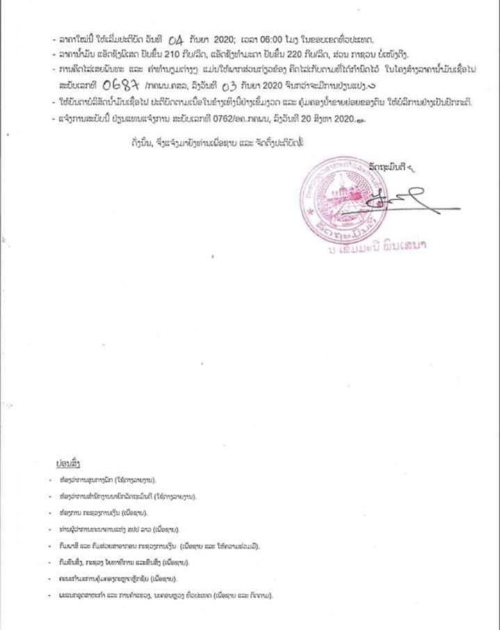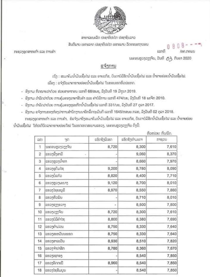 ໃນວັນທີ 3 ກັນຍາ 2020 ກະຊວງອຸດສາຫະກໍາ ແລະການຄ້າໄດ້ອອກແຈ້ງການເຖິງສະມາຄົມນໍ້າມັນເຊື້ອໄຟ ແລະອາຍແກ໊ສ, ບັນດາບໍລິສັດນໍ້າມັນເຊື້ອໄຟເລື່ອງແຈ້ງການປັບຂຶ້ນລາຄານໍ້າມັນເຊື້ອໄຟໃນຂອບເຂດທົ່ວປະເທດຊຶ່ງເລີ່ມຈັດຕັ້ງປະຕິບັດຕັ້ງແຕ່ເວລາ 6:00 ໂມງຂອງວັນທີ 4 ກັນຍາ 2020 ເປັນຕົ້ນໄປ ແລະການປັບລາຄາຄັ້ງນີ້ແມ່ນໄດ້ປັບລາຄານໍ້າມັນແອັດຊັງພິເສດຂຶ້ນ 210 ກີບຕໍ່ລິດ, ແອັດຊັງທໍາມະດາປັບຂຶ້ນ 220 ກີບຕໍ່ລິດ, ສ່ວນນໍ້າມັນກາຊວນແມ່ນບໍ່ເໜັງຕີງສະເພາະນະ ຄອນຫຼວງວຽງຈັນ ແອັດຊັງພິເສດໃຫ້ຂາຍໃນລາຄາ 8.720 ກີບຕໍ່ລິດ, ທຳມະດາ 8.300 ກີບຕໍ່ລິດ ແລະກາຊວນ 7.610 ກີບຕໍ່ລິດ, ແຂວງຜົ້ງສາລີ ແອັດຊັງ