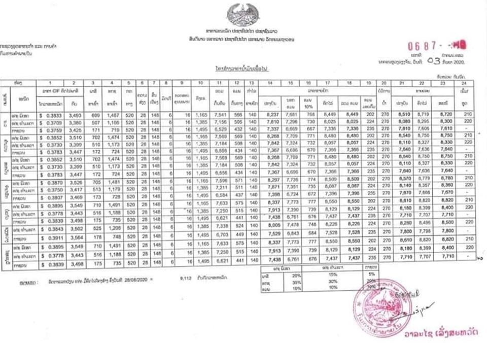 ທໍາມະດາ 9.060 ກີບ, ກາຊວນ 8.370 ກີບ, ຫຼວງນໍ້າທາ ແອັດຊັງທຳມະດາ 8.660 ກີບ, ກາຊວນ 7.970 ກີບ, ອຸດົມໄຊ ແອັດຊັງພິເສດ 9.200 ກີບ, ແອັດຊັງທໍາມະດາ 8.780 ກີບ, ກາຊວນ 8.090 ກີບ, ແຂວງບໍ່ແກ້ວ ແອັດຊັງພີເສດ 8.820 ກີບ, ທໍາມະດາ 8.400 ກີບ ແລະກາຊວນ 7.710 ກີບ, ຫຼວງພະບາງແອັດຊັງພິເສດ 9.120 ກີບ, ແອັດຊັງທໍາມະດາ 8.700 ກີບ, ກາຊວນ 8.010 ກີບ, ແຂວງໄຊຍະບູລີ ແອັດຊັງພິເສດ 8.970 ກີບ, ແອັດຊັງທໍາມະດາ 8.550 ກີບ, ກາຊວນ 7.860 ກີບ, ຫົວພັນ ແອັດຊັງທຳມະດາ 8.710 ກີບ, ກາຊວນ 8.010 ກີບ, ຊຽງ ຂວາງແອັດຊັງທຳມະດາ 8.500 ກີບ, ກາຊວນ 7.800 ກີບ, ແຂວງວຽງຈັນ ແອັດຊັງພິເສດ 8.700 ກີບ, ທຳມະດາ 8.300 ກີບ, ກາຊວນ 7.610 ກີບ, ບໍລິຄຳໄຊ ແອັດຊັງພີເສດ 8.800 ກີບ, ທຳມະດາ 8.380 ກີບ, ກາຊວນ 7.690 ກີບ.