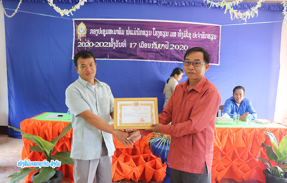 ພ້ອມດຽວກັນນີ້ກອງປະຊຸມຍັງໄດ້ເປັນເອກະພາບກັນຮັບຮອງເອົາຄະນະປະທານສະມາຄົມຊຸດໃໝ່ຈຳນວນ 9 ທ່ານ, ຍິງ 3 ທ່ານ, ກໍາມະການ 14 ທ່ານ, ຍິງ 2 ທ່ານ ແລະໄດ້ຮັບຮອງເອົາກົດລະບຽບຂອງໂຮງຮຽນບາງມາດຕາທີ່ປັບປຸງໃໝ່ໃຫ້ສອດຄ່ອງກັບສະພາບຕົວຈິງ, ຈາກນັ້ນກອງປະຊຸມຍັງໄດ້ມອບໃບກຽດຕິຄຸນ ແລະໃບຊົມເຊີຍຂອງທ່ານເຈົ້າເມືອງໃຫ້ກັບຜູ້ທີ່ມີຄຸນງາມ, ຄວາມດີປະກອບຊຸກຍູ້ເປັນວັດຖຸ, ສິ່ງຂອງຕ່າງໆ ເຂົ້າໃນການຮຽນການສອນຂອງໂຮງຮຽນນຳອີກ.