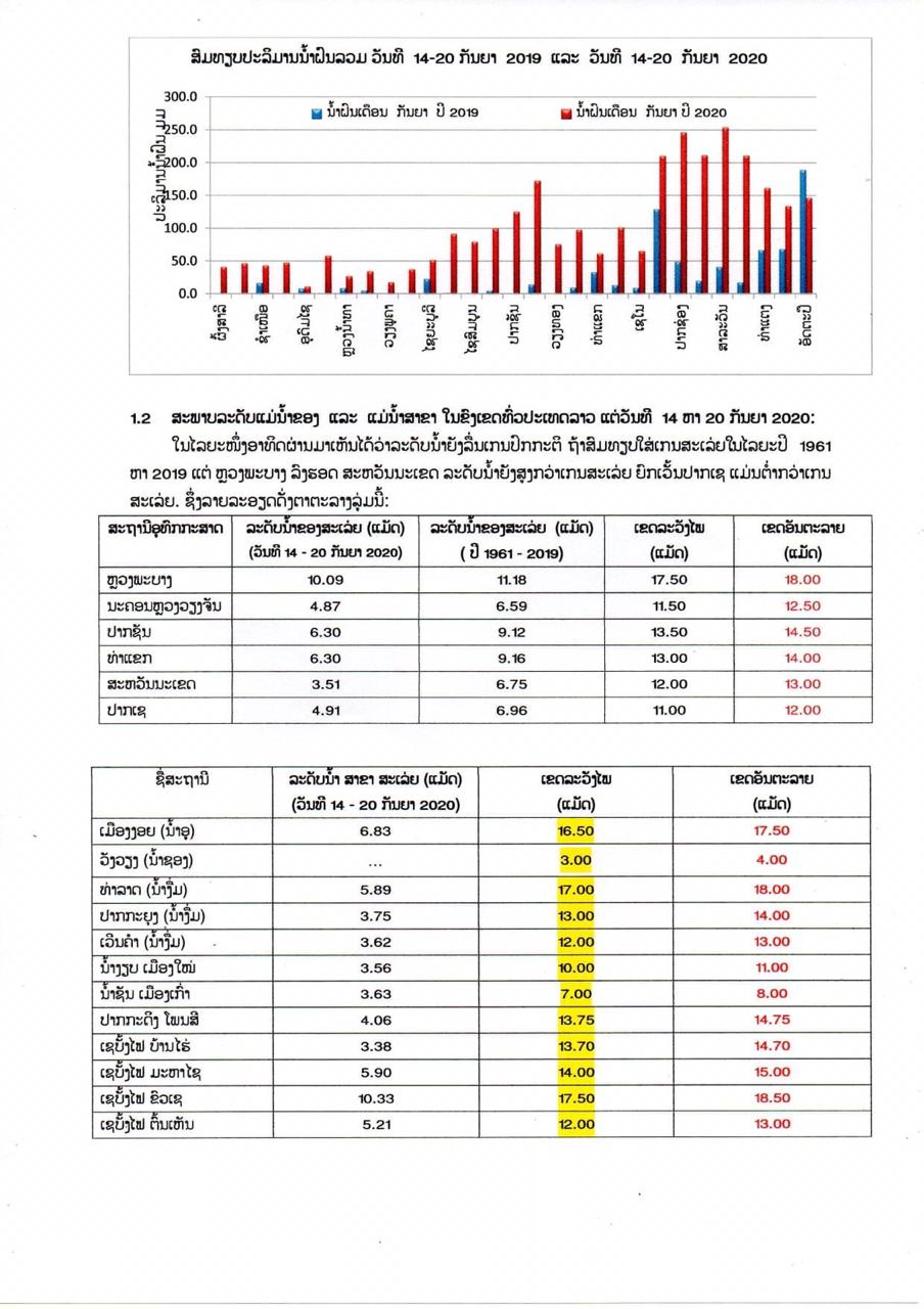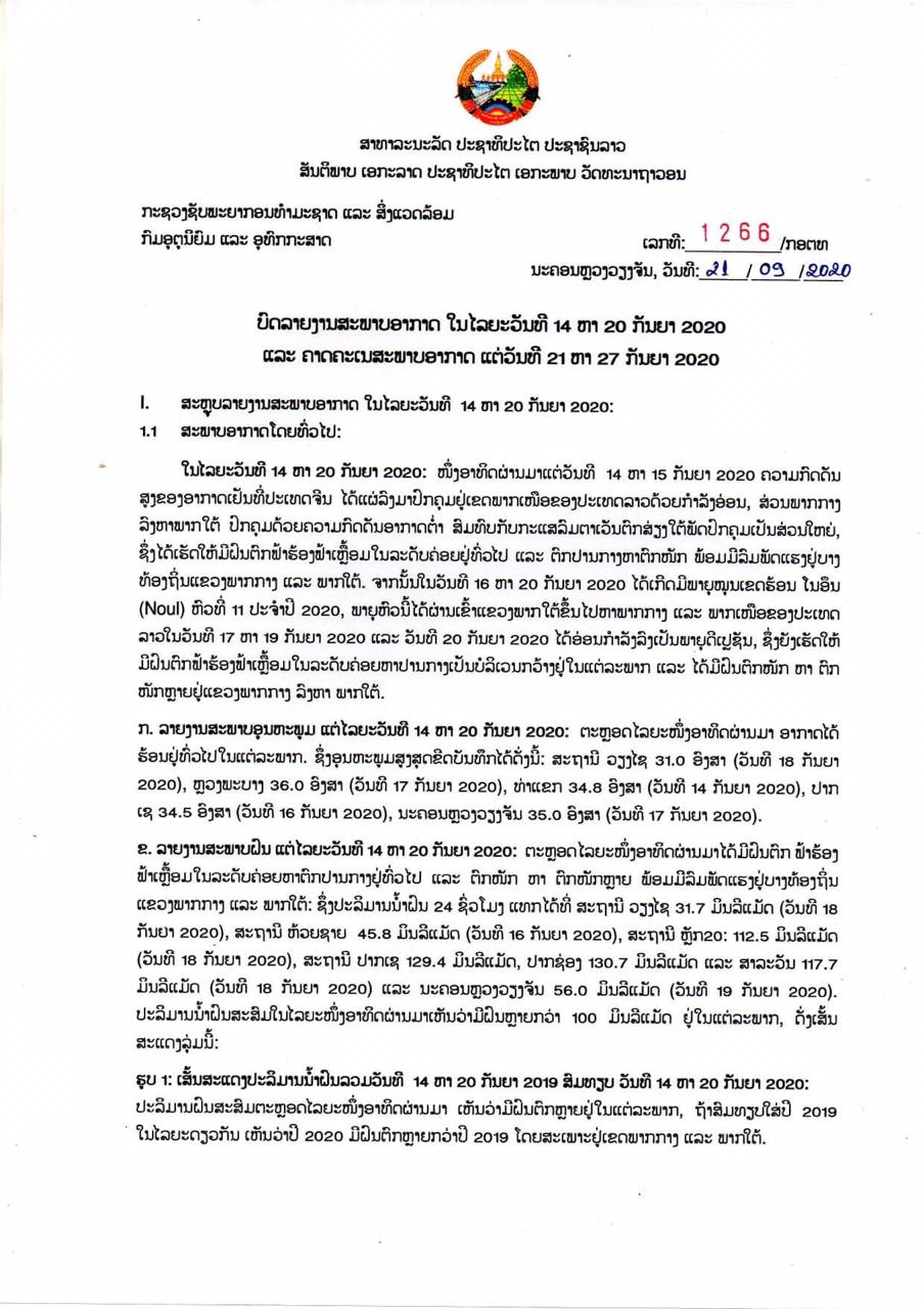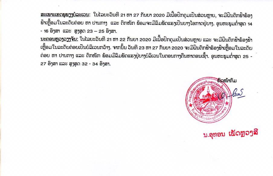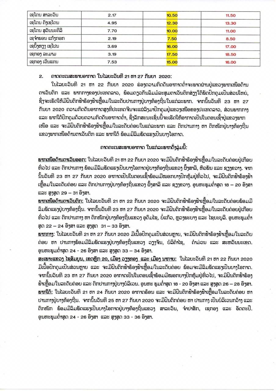 ກົມອຸຕຸນິຍົມ ແລະອຸທົກກະສາດໄດ້ຄາດຄະເນສະພາບອາກາດໃນໄລຍະວັນທີ 21 ຫາ 27 ກັນຍາ 2020 ວ່າ: ໃນໄລຍະວັນທີ 21 ຫາ 22 ກັນຍາ 2020 ຮ່ອງຄວາມກົດດັນອາກາດຕໍ່າຈະພາດຜ່ານຢູ່ແຂວງພາກເຫນືອດ້ານຕາເວັນຕົກ ແລະພາກກາງຂອງປະເທດລາວ, ພ້ອມດຽວກັນລົມມໍລະສຸມຕາເວັນຕົກສ່ຽງໃຕ້ພັດປົກຄຸມເປັນສ່ວນໃຫຍ່, ຊຶ່ງຈະເຮັດໃຫ້ມີຝົນຕົກຟ້າຮ້ອງຟ້າເຫຼື້ອມໃນລະດັບປານກາງຢູ່ບາງທ້ອງຖິ່ນໃນແຕ່ລະພາກ.