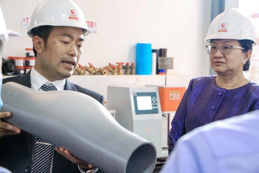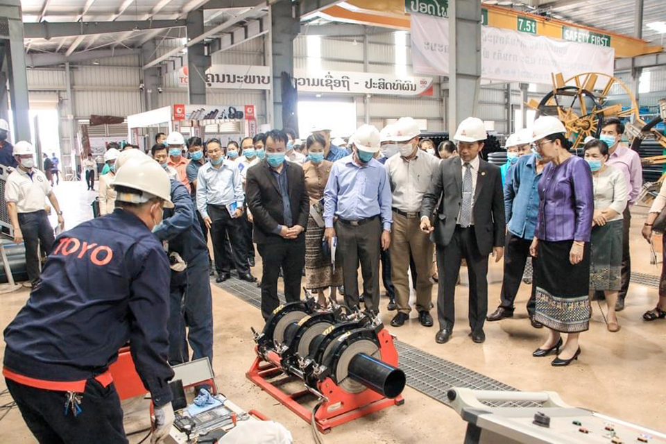 ທ່ານ ລັງກອນ ໄຊຍະວົງ ລາຍງານທ່ານລັດຖະມົນຕີພ້ອມຄະນະໄດ້ຮັບຟັງການລາຍງານກ່ຽວກັບການຂະຫຍາຍຕົວຂອງບໍລິສັດໂດຍຫຍໍ້ຊຶ່ງສະເຫນີໂດຍທ່ານ ລັງກອນ ໄຊຍະວົງ ໂຮງງານອຸດສາຫະກຳໂຕໂຢລາວຈຳກັດ ໄດ້ສ້າງຕັ້ງຂຶ້ນໃນປີ 2016 ເພື່ອຜະລິດທໍ່ ແລະອຸປະກອນກໍ່ສ້າງລະບົບນໍ້າ, ໄດ້ຮັບການຖ່າຍທອດເຕັກໂນໂລຊີຈາກຕ່າງປະເທດ, ປັດຈຸບັນປະກອບມີ 2 ສາຂາ ແລະ 800 ກວ່າຕົວແທນຈຳໜ່າຍທົ່ວປະເທດ, ໃນນັ້ນຕັ້ງຢູ່ ບ້ານໄຊສະຫວ່າງ 1 ສາງໃຫຍ, ບ້ານສະພັງມຶກ ເມືອງໄຊທານີ, ບ້ານສີບຸນເຮືອງ ເມືອງຈັນທະບູລີ, ບ້ານຫນອງໜຽວ ເມືອງສີໂຄດຕະບອງ ແລະໂຮງງານອຸດສາຫະກຳໂຕໂຢລາວ ຈຳກັດຜູ້ດຽວ, ບ້ານໂພຄໍາ ເມືອງໄຊທານີ, ສ່ວນວັດຖຸດິບໄດ້ນຳເຂົ້າມາຈາກຕ່າງປະເທດຄື: ໄທ, ຫວຽດນາມ, ສິງກະໂປ, ແຄວນໄຕ້ຫວັນ.