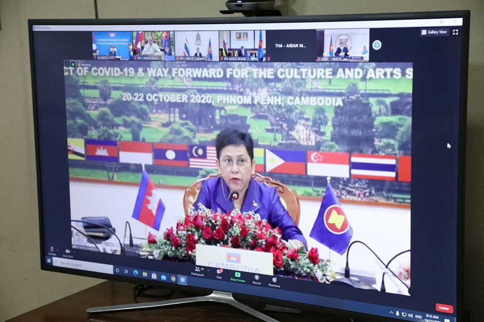 ກອງປະຊຸມທາງໄກ ລັດຖະມົນຕີ ຮັບຜິດຊອບວຽກງານວັດທະນະທຳ ແລະສິລະປະອາຊຽນຄັ້ງທີ 9 ພາຍໃຕ້ຫົວຂໍ້ “ຜົນກະທົບຂອງໂຄວິດ-19 ແລະທິດທາງຕໍ່ໜ້າຢູ່ໃນຂົງເຂດວຽກງານວັດທະນະທຳ ແລະສິລະປະ”, ໄດ້ຈັດຂຶ້ນໃນຕອນເຊົ້າຂອງວັນທີ 22 ຕຸລາ 2020 ໂດຍແມ່ນປະເທດກຳປູເຈຍເປັນເຈົ້າພາບຈັດກອງປະຊຸມທາງ ໄກດັ່ງກ່າວ ແລະກອງປະຊຸມປິ່ນອ້ອມ, ໂດຍພາຍໃຕ້ການເປັນປະທານຂອງທ່ານ ນາງ ເຜີ້ງ ສັກ ໂກນາ (PHOEURNG Sackona) ລັດຖະມົນຕີກະຊວງວັດທະ ນະທຳ ແລະສິລະປະກຳແຫ່ງຣາຊະອານາຈັກກຳປູເຈຍ, ຝ່າຍລາວນຳໂດຍທ່ານ ກິແກ້ວ ໄຂຄໍາພິທູນ ລັດຖະມົນຕີກະຊວງຖະແຫຼງຂ່າວ, ວັດທະນະທໍາ ແລະທ່ອງທ່ຽວແຫ່ງ ສປປ ລາວ, ມີບັນດາທ່ານລັດຖະມົນຕີຮັບຜິດຊອບວຽກງານວັດທະນະທຳ ແລະສິລະປະອາຊຽນ, ພ້ອມດ້ວຍພາກສ່ວນທີ່ກ່ຽວເຂົ້າຮ່ວມ.