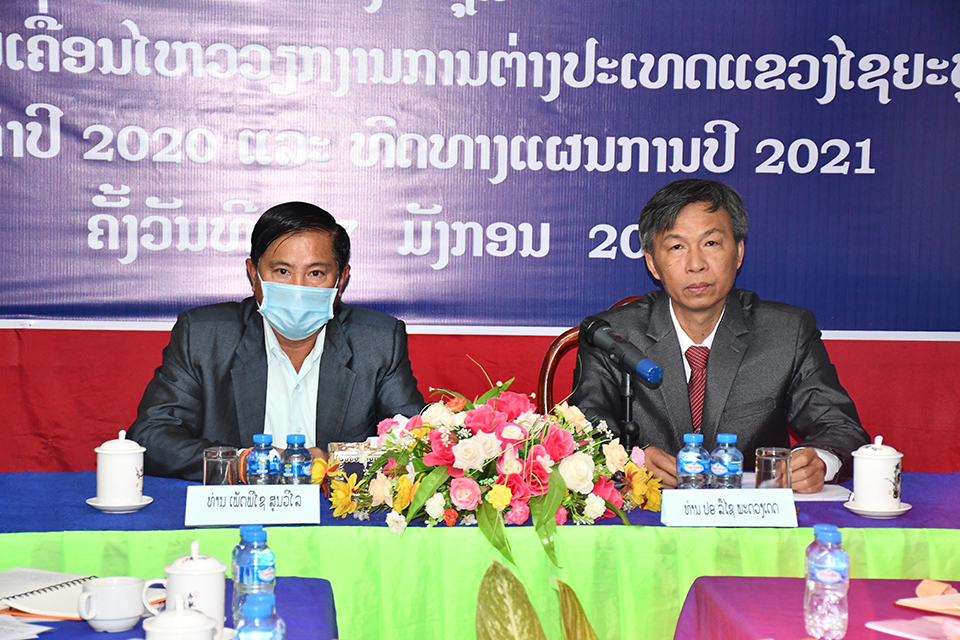 ກອງປະຊຸມສະຫຼຸບວຽກງານການຕ່າງປະເທດປະຈໍາປີ 2020 ແລະທິດທາງແຜນການປີ 2021 ໄດ້ຈັດຂຶ້ນໃນວັນທີ 7 ມັງກອນ 2021 ທີ່ຫ້ອງປະຊຸມພະແນກການຕ່າງປະເທດແຂວງໄຊຍະບູລີ ໂດຍການເປັນປະທານຂອງທ່ານ ລືໄຊ ພະດວງເດດ ຫົວໜ້າພະແນກການຕ່າງປະເທດແຂວງ, ມີທ່ານ ເພັດພິໄຊ ສູນວິໄລ ຮອງເຈົ້າແຂວງ ໄຊຍະບູລີ, ມີຄະນະພະແນກ, ແຂກຖືກເຊີນພ້ອມດ້ວຍຫົວໜ້າ, ຮອງຫົວໜ້າຂະແໜງ, ພະນັກງານລັດຖະກອນພາຍໃນພະແນກການຕ່າງປະເທດເຂົ້າຮ່ວມ.