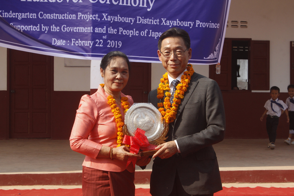 ທ່ານ ນາງບຸນພັກ ອິນທະປັນຍາ ຮອງເຈົ້າແຂວງໄຊຍະບູລີ, ຜູ້ຊີ້ນຳວຽກງານຂົງເຂດວັດທະນາທຳສັງຄົມກໍ່ໄດ້ກ່າວສະແດງຄວາມຂອບອົກຂອບໃຈ, ຄວາມຮູ້ບຸນຄຸນຕໍ່ລັດຖະບານ ແລະປະຊາຊົນຍີ່ປຸ່ນທີ່ເຫັນຄວາມສຳຄັນໃນການພັດທະນາວຽກງານການສຶກສາໂດຍສະເພາະກໍ່ຄືແຂວງໄຊຍະບູລີ ແລະໃຫ້ຄຳໝັ້ນສັນຍາວ່າຈະນຳໃຊ້ອາຄານຮຽນດັ່ງກ່າວເພື່ອຮັບໃຊ້ໃຫ້ແກ່ການຮຽນ-ການສອນໃຫ້ເກີດປະໂຫຍດສູງສຸດໃຫ້ສົມກັບຄວາມມຸ້ງມາດປະຖະໜາຂອງລັດຖະບານ ແລະປະຊາຊົນຍີ່ປຸ່ນ ທີ່ໃຫ້ການຊ່ວຍເຫຼືອຄັ້ງນີ້ຫວັງຢ່າງຍິ່ງວ່າຈະໄດ້ຮັບການຊ່ວຍເຫຼືອຕື່ມອີກພິທີຍັງໄດ້ມອບໃບກຽດຕິຄຸນຈາກທ່ານເຈົ້າແຂວງ ແລະຂອງຂວັນຈາກເຈົ້າເມືອງ, ຈາກຜູ້ອຳນວຍການໂຮງຮຽນມອບໃຫ້ທ່ານ ຕາເກສິ ຮີກິຮາລາ ເອກອັກຄະລາຊະທູດຍີ່ປຸ່ນປະຈຳລາວ.