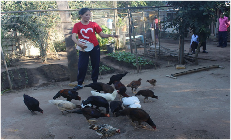 ພາຍຫຼັງສຳເລັດການຝຶກອົບຮົມວິທີການປູກ-ການລ້ຽງແລ້ວຄອບຄົວຂອງຂ້າພະເຈົ້າຈຶ່ງໄດ້ຕັດສິນໃຈລ້ຽງສັດຄື: ການລ້ຽງໄກ່ສ່ວນແນວພັນໄກ່ແມ່ນທາງໂຄງການເອສເຊບເພີ່ນສະໜອງໃຫ້ ແລະກໍເປັນອາຊີບທີ່ຂ້າພະເຈົ້າເຄີຍເຮັດມາແຕ່ກ່ອນ, ຫຼັງຈາກໄດ້ປະກອບອາຊີບລ້ຽງໄກ່ມາຂາຍເຫັນໄດ້ຢ່າງຈະແຈ້ງວ່າຊີວິດການເປັນຢູ່ຂອງຄອບ ຄົວໄດ້ມີການຫັນປ່ຽນດີຂຶ້ນເປັນກ້າວໆຊຶ່ງຄອບຄົວຂອງຂ້າພະເຈົ້າມີໄກ່ຢູ່ທັງໝົດປະມານ 300 ກວ່າໂຕ,ຂາຍໃນລາຄາ 50 ພັນກີບຕໍ່ກີໂລ, ສຳລັບໄກ່ນ້ອຍອາຍຸປະມານ 2-3 ອາທິດ ແມ່ນຂາຍເປັນຄູ່, ໃນລາຄາ 10 ພັນກີບຕໍ່ຄູ່,ເດືອນໜຶ່ງໄດ້ຂາຍໄກ່ປະມານ 10-20 ກວ່າໂຕ ໄດ້ເງິນປະມານ 5 ແສນກີບຕໍ່ເດືອນສະຫຼຸບລວມໄດ້ຮັບເງິນ ເຂົ້າຄອບຄົວປະມານ 6 ລ້ານກີບຕໍ່ປີ.