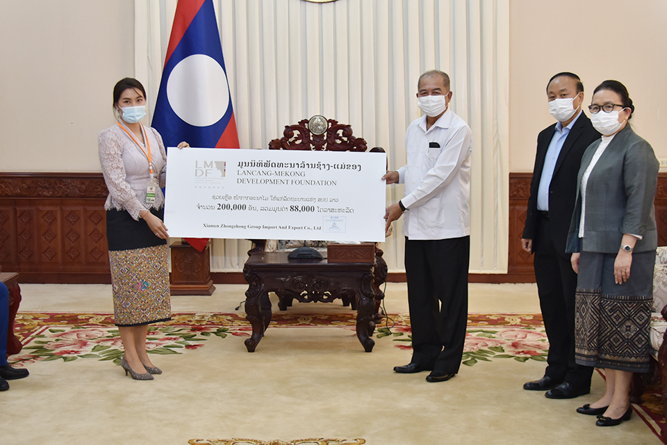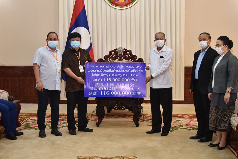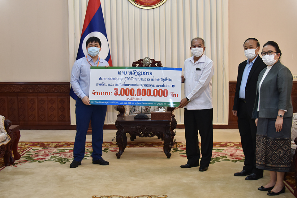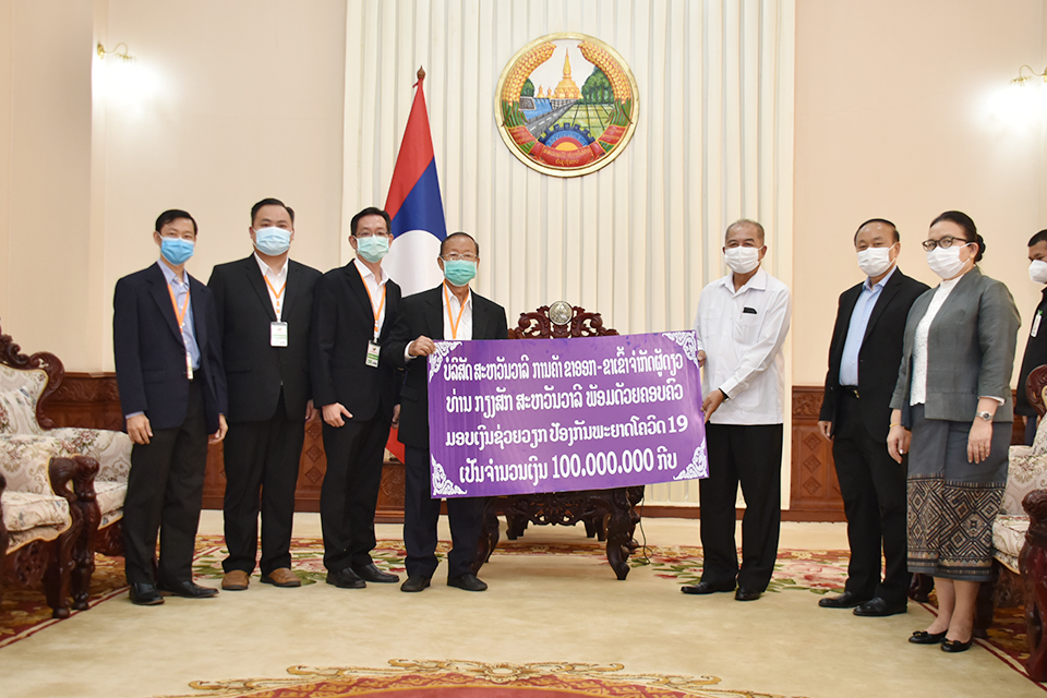ໃນນາມສ່ວນຕົວກໍ່ຄືຄອບຄົວທ່ານ ຫວັງຊຸນຄາຍ ມອບເງິນ ຈຳນວນ 3 ຕື້ກີບ; ບໍລິສັດ ຊິສເມຕິກ ໄອທີ ໂຊລູຊັ້ນ ຊຶ່ງເປັນບໍລິສັດໃນກຸ່ມບໍລິສັດ AIF Group ມອບເງິນ ຈຳ ນວນ 1 ຕື້ກີບ; ມູນນິທິພັດທະນາລ້ານຊ້າງ-ແມ່ຂອງ ມອບຜ້າປິດປາກ-ດັງ ຈຳນວນ 200.000 ອັນ, ມູນຄ່າ 88.000 ໂດລາສະຫະລັດ; ສະພາການຄ້າ ຟູຈ້ຽນ ປະຈຳ ສປປ ລາວ ມອບເງິນ ຈຳນວນ 116 ລ້ານກີບ; ທ່ານ ກຽງສັກ ສະຫວັນວາລີ ພ້ອມດ້ວຍຄອບຄົວມອບເງິນ ຈຳນວນ 100 ລ້ານກີບ; ແລະບໍລິສັດ ສະໄກ ຂຸດຄົ້ນບໍ່ແຮ່ ຈຳກັດ ມອບເງິນ ຈຳນວນ 100 ລ້ານກີບ.