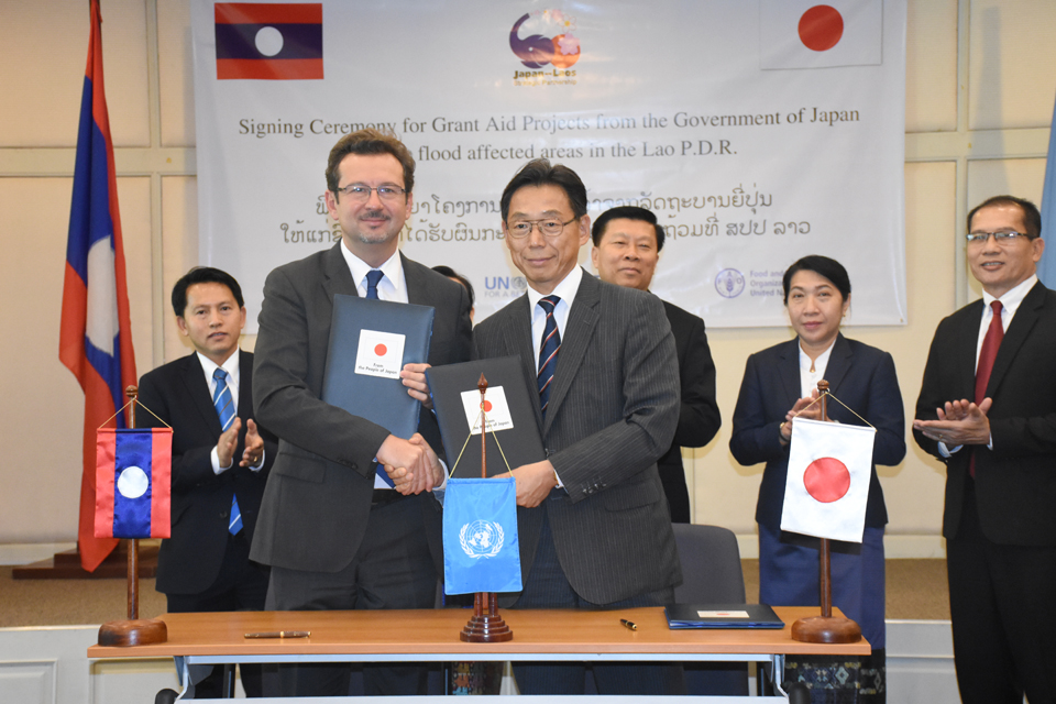 ໃນວັນທີ 6 ມີນາ 2019, ທີ່ຫ້ອງການອົງການສະຫະປະຊາຊາດໄດ້ມີພິທີເຊັນສັນຍາໂຄງການຊ່ວຍເຫຼືອລ້າຈາກລັດຖະບານຍີ່ປຸ່ນເພື່ອເປັນການຟື້ນຟູຄວາມເສຍຫາຍທີ່ ສປປ ລາວ ໄດ້ຮັບໃນ ປີຜ່ານມາ, ຈຳນວນ 4 ໂຄງການມູນຄ່າ 7,6 ລ້ານໂດລາ ຫຼືປະມານ 60 ຕື້ກວ່າກີບ, ຊຶ່ງຕາງໜ້າລັດຖະບານຍີ່ປຸ່ນຮ່ວມ ລົງນາມຂອງທ່ານ ທາເຄຊິ ຣິຄິຮາຣະ ເອກອັກຄະລາຊະທູດຍີ່ປຸ່ນປະຈຳລາວ, ທ່ານ Octavian Bivol ຜູ້ຕາງໜ້າອົງການສະຫະປະຊາຊາດປະຈໍາລາວ (UN ICEF), ທ່ານ Avi SARKAP ທີ່ປຶກສາພາກພື້ນອົງການ UN-Habitat ປະຈໍາລາວ, ທ່ານ Nasar HAYAT ຜູ້ຕາງໜ້າອົງການ FAO ປະຈໍາລາວ, ພ້ອມນັ້ນຍັງມີບັນດາຮອງລັດຖະມົນຕີກະຊວງທີ່ກ່ຽວຂ້ອງເຂົ້າຮ່ວມ ແລະ ເປັນສັກຂີພິຍານ.
