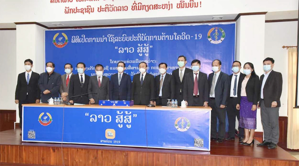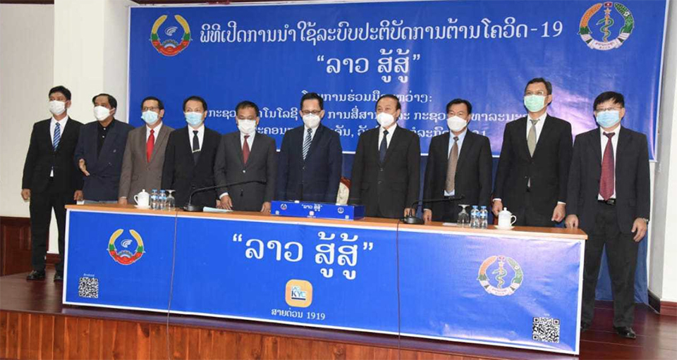 ພິທີເປີດການນໍາໃຊ້ລະບົບປະຕິບັດການຕ້ານໂຄວິດ-19 “ລາວ ສູ້ສູ້” ໂດຍການຮ່ວມມືລະຫວ່າງກະຊວງເຕັກໂນໂລຊີ ແລະການສື່ສານ ແລະກະຊວງສາທາລະນະສຸກ ໄດ້ຈັດຂຶ້ນໃນວັນທີ 5 ກໍລະກົດນີ້ ທີ່ກະຊວງສາທາລະນະສຸກໂດຍມີທ່ານ ບຸນແຝງ ພູມມະໄລສິດ ລັດຖະມົນຕີກະຊວງສາທາລະນະສຸກ, ທ່ານ ສັນຕິສຸກ ສິມມະລາວົງ ຮອງລັດຖະມົນຕີກະຊວງເຕັກໂນໂລຊີ ແລະການສື່ສານພ້ອມດ້ວຍແຂກຖືກເຊີນເຂົ້າຮ່ວມ.