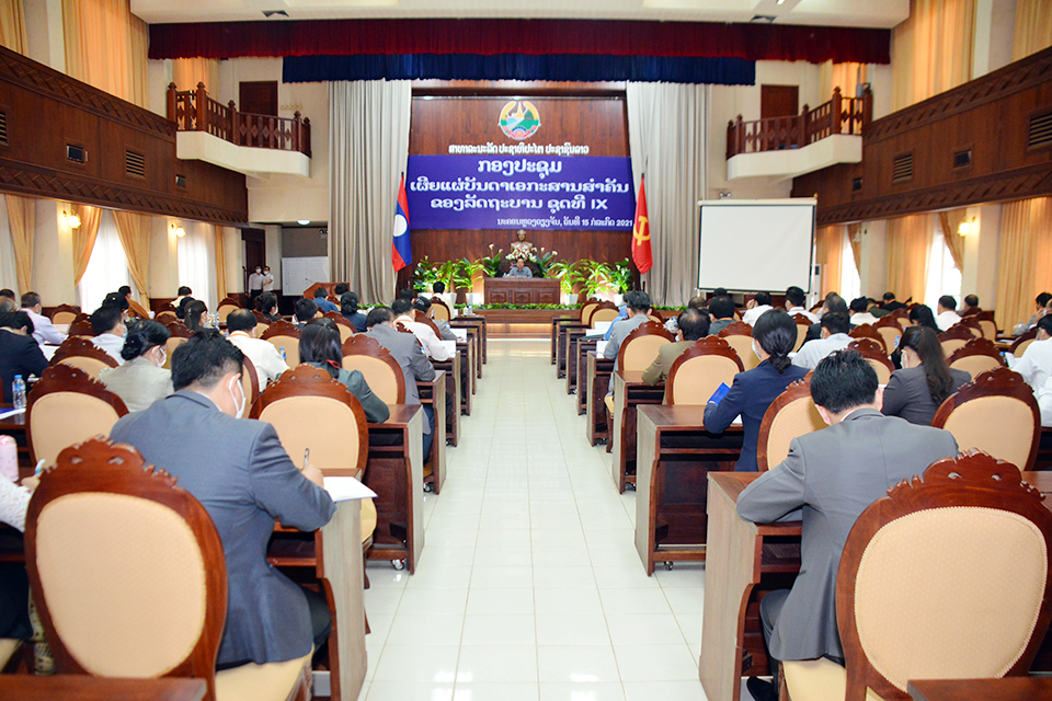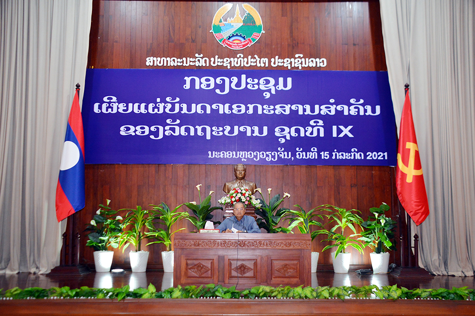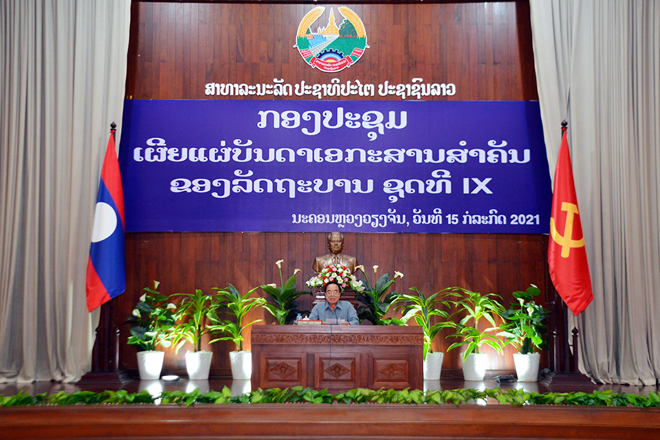 ໃນຕອນເຊົ້າ ວັນທີ 15 ກໍລະກົດ 2021 ທີ່ຫ້ອງວ່າການສຳນັກງານນາຍົກລັດຖະມົນຕີ (ຫສນຍ) ໄດ້ຈັດກອງປະຊຸມເຜີຍແຜ່ເອກະສານສຳຄັນຂອງລັດຖະບານຊຸດທີ IX, ພາຍໃຕ້ການເປັນປະທານຂອງທ່ານ ຄຳເຈນ ວົງໂພສີ, ລັດຖະມົນຕີ, ຫົວໜ້າຫ້ອງວ່າການສຳນັກງານນາຍົກລັດຖະມົນຕີ; ໂດຍການໃຫ້ກຽດເຂົ້າຮ່ວມໂອ້ລົມຂອງທ່ານ ກິແກ້ວ ໄຂຄຳພິທູນ,ຮອງນາຍົກລັດຖະມົນຕີ;ມີບັນດາທ່ານຮອງລັດຖະມົນຕີ,ຮອງຫົວໜ້າອົງການທຽບເທົ່າຂັ້ນສູນກາງ,ຫົວໜ້າຫ້ອງການກະຊວງ-ອົງການ ແລະຫົວໜ້າກົມທີ່ກ່ຽວຂ້ອງ, ພ້ອມດ້ວຍຫົວໜ້າກົມ, ຮອງຫົວໜ້າກົມພາຍໃນຫ້ອງວ່າການສຳນັກງານນາຍົກລັດຖະມົນຕີເຂົ້າຮ່ວມ.