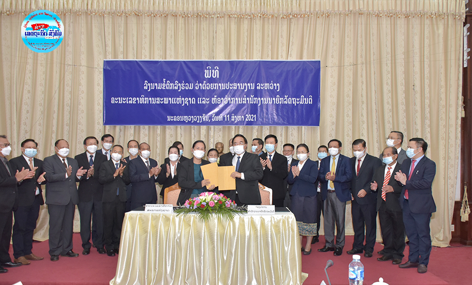 ໃນຕອນບ່າຍວັນທີ 11 ສິງຫາ 2021 ທີ່ຫ້ອງປະຊຸມຄະນະເລຂາທິການສະພາແຫ່ງຊາດ (ຫຼັກ 6) ໄດ້ຈັດພິທີລົງນາມຂໍ້ຕົກລົງຮ່ວມວ່າດ້ວຍການປະສານງານ ລະຫວ່າງຄະນະເລຂາທິການສະພາແຫ່ງຊາດ (ຄລສ) ແລະຫ້ອງວ່າການສໍານັກງານາຍົກລັດຖະມົນຕີ (ຫສນຍ), ໂດຍການໃຫ້ກຽດເຂົ້າຮ່ວມເປັນສັກຂີພະຍານຂອງທ່ານ ກິແກ້ວ ໄຂຄໍາພິທູນ, ຮອງນາຍົກ ລັດຖະມົນຕີ ແລະ ທ່ານ ນາງ ສູນທອນ ໄຊຍະຈັກ, ຮອງປະທານສະພາແຫ່ງຊາດ; ມີທ່ານລັດຖະມົນຕີ, ຫົວໜ້າຫ້ອງວ່າການສໍານັກງານນາຍົກລັດຖະມົນຕີ, ທ່ານຫົວໜ້າຄະນະເລຂາທິການສະພາແຫ່ງຊາດພ້ອມດ້ວຍບັນດາປະທານກຳມາທິການຂອງສະພາແຫ່ງຊາດ,ຮອງລັດຖະມົນຕີ, ຮອງຫົວໜ້າຫ້ອງວ່າການສໍານັກງານນາຍົກລັດຖະມົນຕີ, ຫົວໜ້າກົມ-ຮອງຫົວໜ້າກົມ ແລະພະນັກງານກ່ຽວຂ້ອງຂອງສອງຝ່າຍເຂົ້າຮ່ວມ.