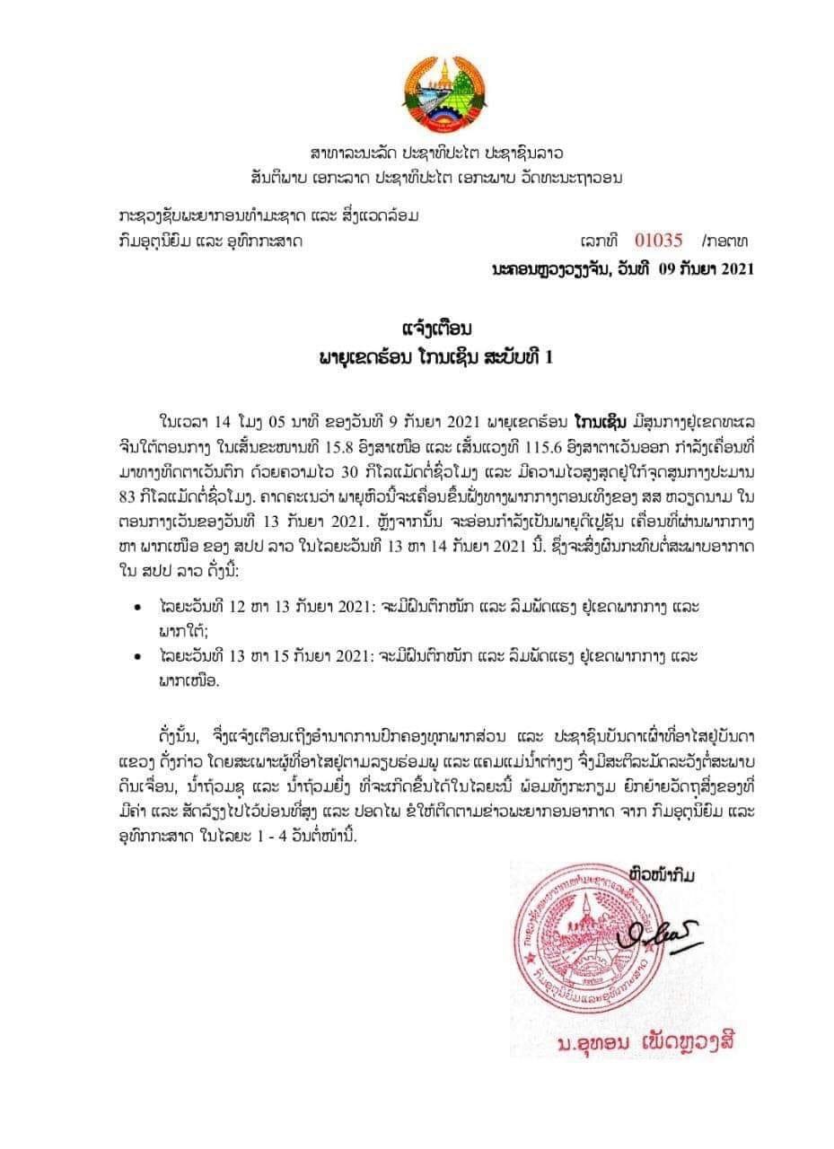 ກົມອຸຕຸນິຍົມ ແລະອຸທົກກະສາດ ແຈ້ງເຕືອນພາຍຸເຂດຮ້ອນ ໂກນເຊິນ ສະບັບທີ 1 ໃນເວລາ 14:05 ໂມງຂອງວັນທີ 9 ກັນຍາ 2021 ພາຍຸເຂດຮ້ອນໂກນເຊິນ ມີສູນກາງຢູ່ເຂດທະເລຈີນໃຕ້ຕອນກາງໃນເສັ້ນຂະໜານທີ 15,8 ອົງສາເໜືອ ແລະເສັ້ນແວງທີ 115.6 ອົງສາຕາເວັນອອກ ກໍາລັງເຄື່ອນທີ່ມາທາງທິດຕາເວັນຕົກ ດ້ວຍຄວາມໄວ 30 ກິໂລແມັດຕໍ່ຊົ່ວໂມງ ແລະມີຄວາມໄວສູງສຸດຢູ່ໃກ້ຈຸດສູນກາງປະມານ 83 ກິໂລແມັດຕໍ່ຊົ່ວໂມງ. ຄາດຄະເນວ່າພາຍຸຫົວນີ້ຈະເຄື່ອນຂຶ້ນຝັ່ງທາງພາກກາງຕອນເທິງຂອງ ສສ ຫວຽດນາມ ໃນຕອນກາງເວັນຂອງວັນທີ 13 ກັນຍາ 2021. ຫຼັງຈາກນັ້ນຈະອ່ອນກຳລັງເປັນພາຍຸດີເປຼຊັນເຄື່ອນທີ່ຜ່ານພາກກາງ ຫາ ພາກເໜືອ ຂອງ ສປປ ລາວ ໃນໄລຍະວັນທີ 13 ຫາ 14 ກັນຍາ 2021 ນີ້, ຊຶ່ງຈະສົ່ງຜົນກະທົບຕໍ່ສະພາບອາກາດໃນ ສປປ ລາວ ດັ່ງນີ້: