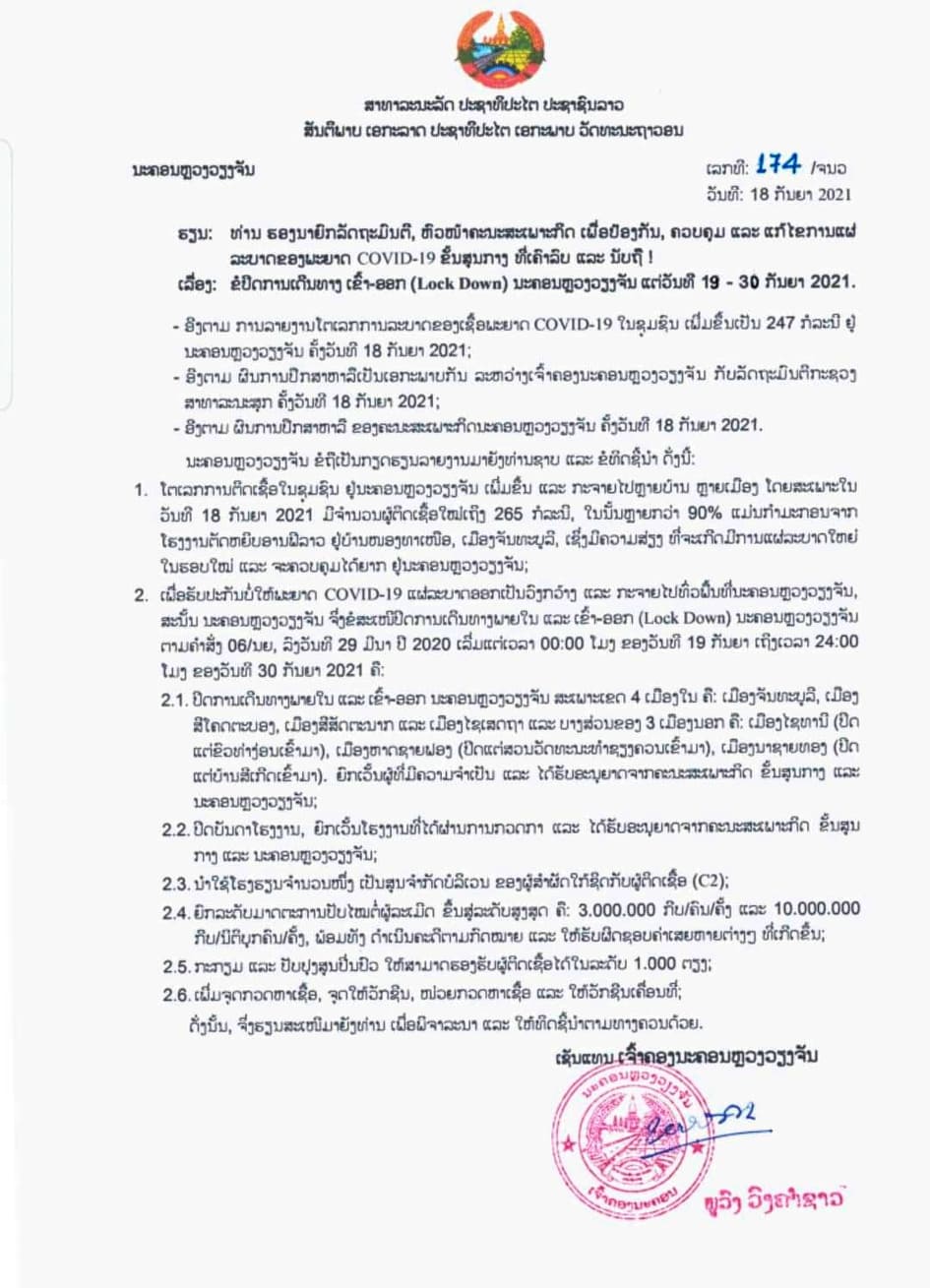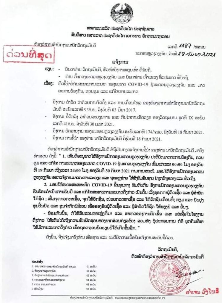 ດ່ວນ!! ຫ້ອງວ່າການສຳນັກງານນາຍົກລັດຖະມົນຕີ ເຫັນດີໃຫ້ນະຄອນຫລວງວຽງຈັນລັອກດາວນະຄອນຫລວງວຽງຈັນ ເລີ່ມແຕ່ເວລາ 00:00 ໂມງ ຂອງວັນທີ 19 ກັນຍາ-ເວລາ 24:00 ໂມງ ຂອງວັນທີ 30 ກັນຍາ 2021 ເພື່ອປ້ອງກັນ ແລະຄວບຄຸມພະຍາດໂຄວິດ-19 ບໍ່ໃຫ້ມີການແຜ່ລະບາດໄປເປັນວົງກ້ວາງ.