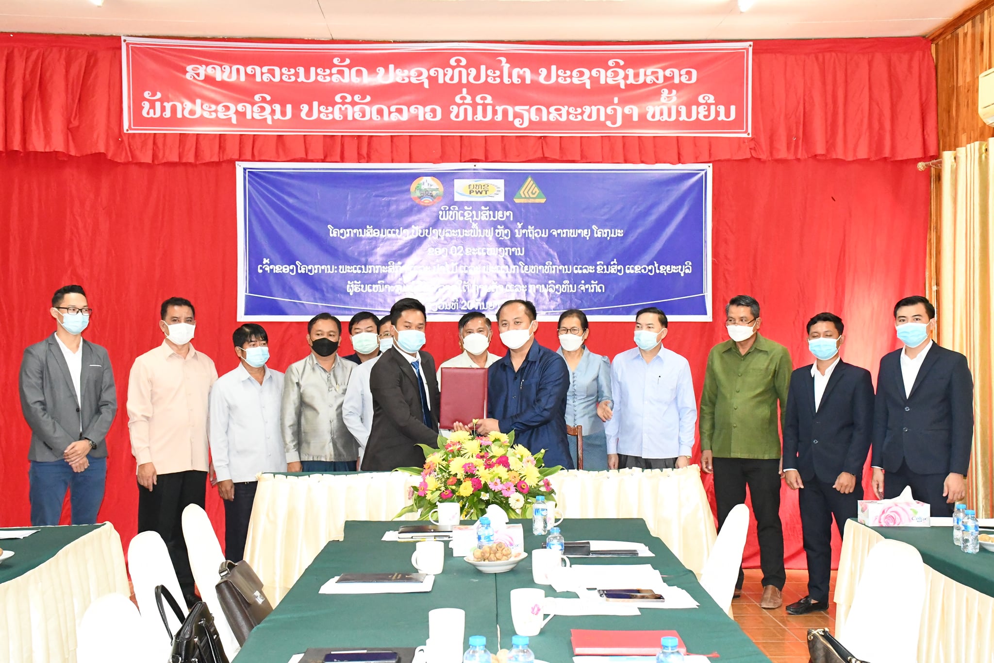 ຕອນທ້າຍທ່ານ ຄໍາເພັດ ພົມມະລາດ ຫົວໜ້າພະແນກ ຍທຂ, ທ່ານ ບຸດສະກອນ ອິນທະລັງສີ ຫົວໜ້າພະແນກກະສິກໍາ ແລະປ່າໄມ້ແຂວງໃນນາມເຈົ້າຂອງໂຄງການ ແລະ ທ່ານ ແສງຈັນ ໝັ້ນແສນສຸກ ປະທານກຸ່ມບໍລິສັດລາວໃຕ້ການຄ້າ ແລະ ການລົງທຶນຈໍາກັດໃນນາມຜູ້ຮັບເໝົາກໍ່ສ້າງໄດ້ຮ່ວມກັນເຊັນບົດບັນທຶກການກໍ່ສ້າງທັງ 2 ຂະແໜງຢ່າງເປັນທາງການໂດຍເຂົ້າຮ່ວມເປັນສັກຂີພິຍານຂອງທ່ານ ເພັດພິໄຊ ສູນວິໄລ ຮອງເຈົ້າແຂວງໄຊຍະບູລີພ້ອມດ້ວຍແຂກທີ່ເຂົ້າຮ່ວມ.