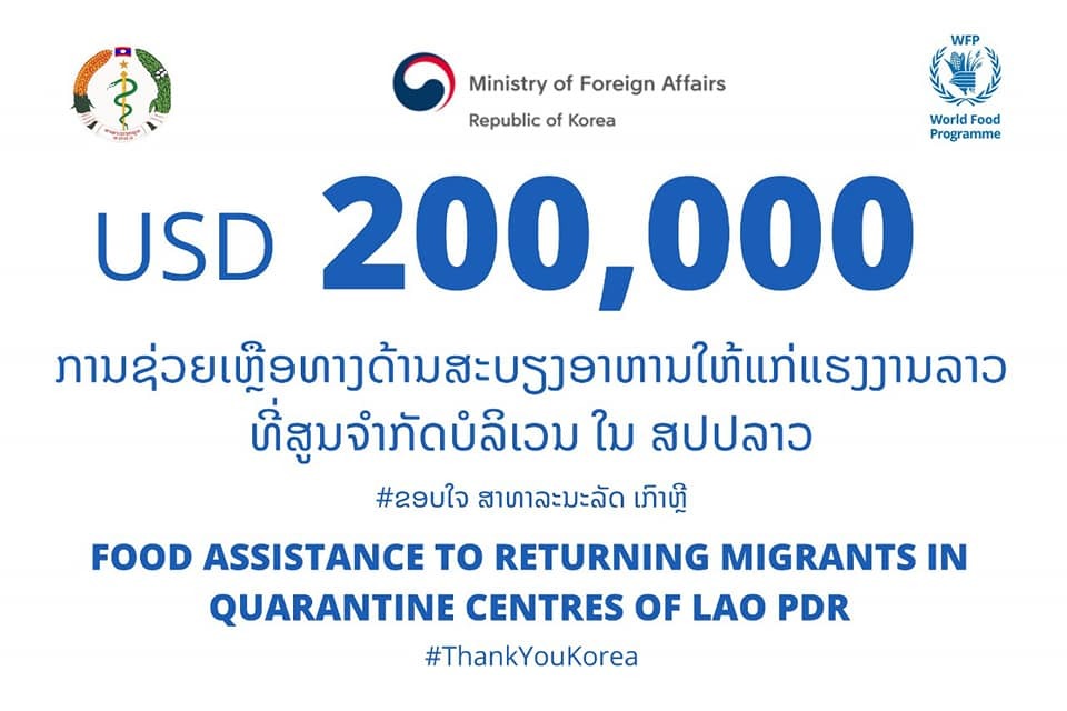 ກະຊວງການຕ່າງປະເທດຂອງສາທາລະນະລັດ ເກົາຫຼີ ໄດ້ມອບເງິນຊ່ວຍເຫຼືອທາງດ້ານມະນຸດສະທໍາເປັນມູນຄ່າ 200,000 ໂດລາສະຫະລັດອາເມລິກາໃຫ້ແກ່ ສປປ ລາວ ໃນການຮັບມືກັບການລະບາດຂອງພະຍາດ ໂຄວິດ-19. ການຊ່ວຍເຫຼືອໃນຄັ້ງນີ້ຈະຊ່ວຍໃຫ້ອົງການອາຫານໂລກສາມາດສືບຕໍ່ໃຫ້ຄວາມຊ່ວຍເຫຼືອທາງດ້ານສະບຽງອາຫານໃຫ້ແກ່ບັນດາແຮງງານທີ່ກັບຄືນມາທີ່ຢູ່ໃນ 18 ສູນຈໍາກັດບໍລິເວນ ໃນທົ່ວ 7 ແຂວງ ຂອງ ສປປ ລາວ. ອົງການອາຫານໂລກ ແລະບັນດາອົງການເພື່ອນຮ່ວມງານໄດ້ແກ່-ອົງການກາແດງສະວີດສ, ອົງການກາແດງລາວ ແລະອົງການສຸພະນິມິດສາກົນຈະໄດ້ມອບອາຫານທີ່ມີໂພຊະນາການ ຈໍານວນ 3 ຄາບໃນແຕ່ລະມື້ໃຫ້ແກ່ແຮງງານທີ່ກັບຄືນມາຫຼາຍກວ່າ 5.600 ຄົນ.