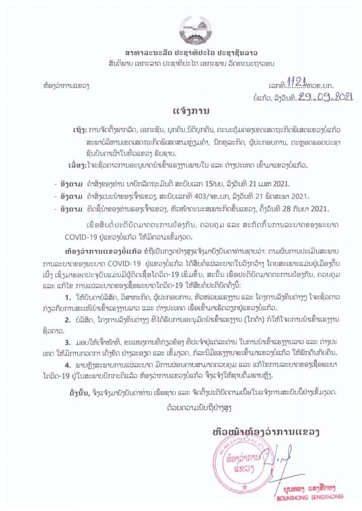 ແຂວງບໍ່ແກ້ວຈຶ່ງອອກແຈ້ງການ ເລກທີ 1121/ຫວຂ.ບກ ລົງວັນທີ 29 ກັນຍາ 2021 ໂດຍໃຫ້ໂຈະຊົ່ວຄາວການອະນຸຍາດນໍາເຂົ້າແຮງງານພາຍໃນ ແລະຕ່າງປະເທດເຂົ້າມາແຂວງບໍ່ແກ້ວທັງນີ້, ກໍ່ເພື່ອສືບຕໍ່ປະຕິບັດມາດຕະການປ້ອງກັນ,ຄວບຄຸມ ແລະສະກັດກັ້ນການລະບາດຂອງພະຍາດ COVID-19 ຢູ່ແຂວງບໍ່ແກ້ວ ຫ້ມີຄວາມເຂັ້ມງວດ.