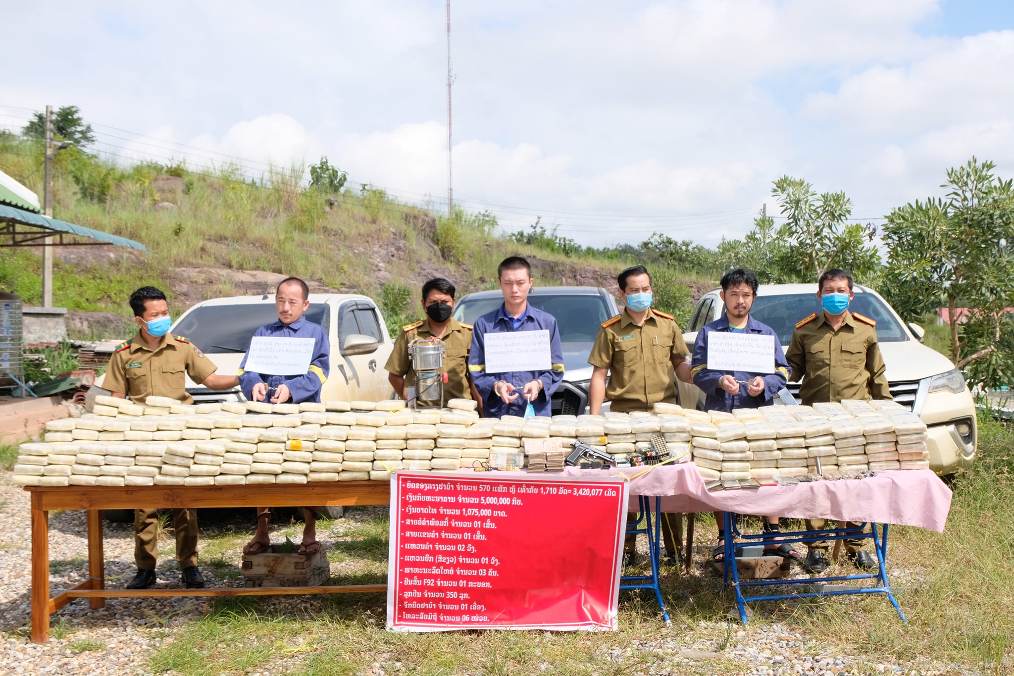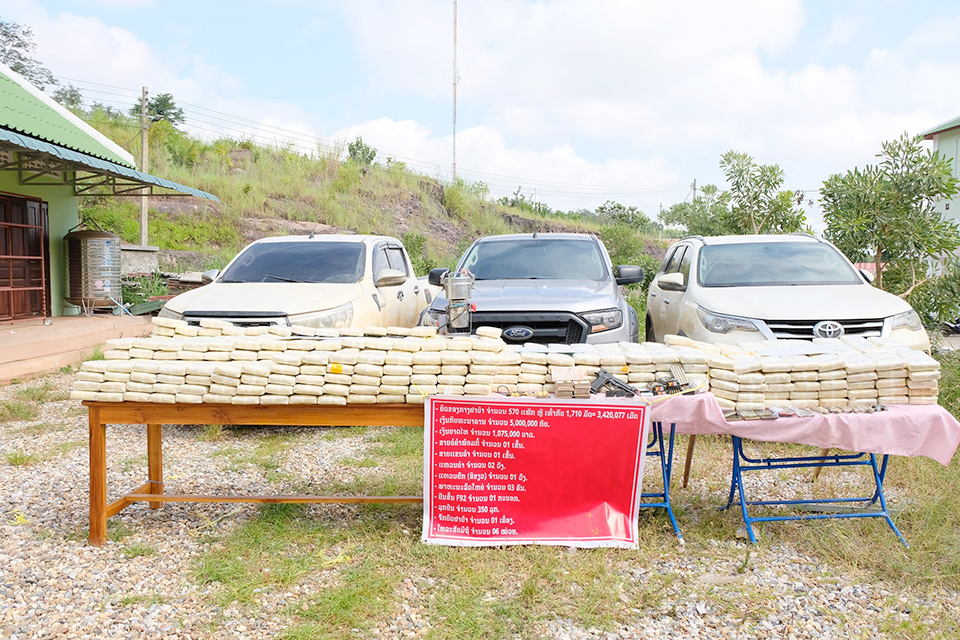 ທ່ານກ່າວຕື່ມວ່າສໍາລັບເປົ້າໝາຍຄັ້ງນີ້ຖືວ່າເປັນລາຍໃຫຍ່ທີ່ສຸດຫາກທຽບໃສ່ຜ່ານມາທີ່ທາງເຈົ້າໜ້າທີ່ສາມາດຍຶດໄດ້ເຊິ່ງຂອງກາງທັງໝົດແມ່ນຍຶດໄດ້ໃນລະຫວ່າງ ວັນທີ 27-31 ສິງຫາ ປີ 2021 ຢູ່ບ້ານປົ່ງດົງ ເມືອງນານ, ບ້ານຊົງຈ່າ, ບ້ານຫຼັກ 50 ເມືອງນໍ້າບາກ, ແຂວງຫຼວງພະບາງ ແລະບ້ານດອນໄຊ, ເມືອງໄຊ ແຂວງອຸດົມໄຊ ເຊິ່ງປະກອບມີຂອງກາງຢາບ້າ ທັງໝົດ 570 ແພັກ ຫຼືເທົ່າກັບ 1.710 ມັດ, ຈຳນວນ 3.420.077 ເມັດ, ເງິນກີບທະນາຄານ ຈໍານວນ 5 ລ້ານກີບ, ເງິນບາດໄທ ຈໍານວນ 1.075.000 ບາດ, ສາຍຄໍຄຳພ້ອມກີ້ ຈໍານວນ 01 ເສັ້ນ, ສາຍແຂນຄໍາ 01 ເສັ້ນ, ແຫວນຄໍາ 02 ວົງ, ແຫວນຍົກ (ສີຂຽວ) 01 ວົງ, ພາຫະນະລົດໃຫຍ່ 03 ຄົນ, ປືນສັ້ນ F92 ຈໍານວນ 01 ກະບອກ, ລູກປຶນ ຈໍານວນ 350 ລູກ,ຈັກບົດຢາບ້າ 01 ເຄື່ອງ ແລະໂທລະສັບມືຖື ຈໍານວນ 06 ໜ່ວຍ. ສໍາລັບຢາບ້າທີ່ຍຶດໄດ້ໃນຄັ້ງນີ້ແມ່ນຈະໄດ້ຍຶດໄວເປັນຂອງກາງເພື່ອດຳເນີນຄະດີຕໍ່ຜູ້ກະທຳຜິດຢ່າງເດັດຂາດ.