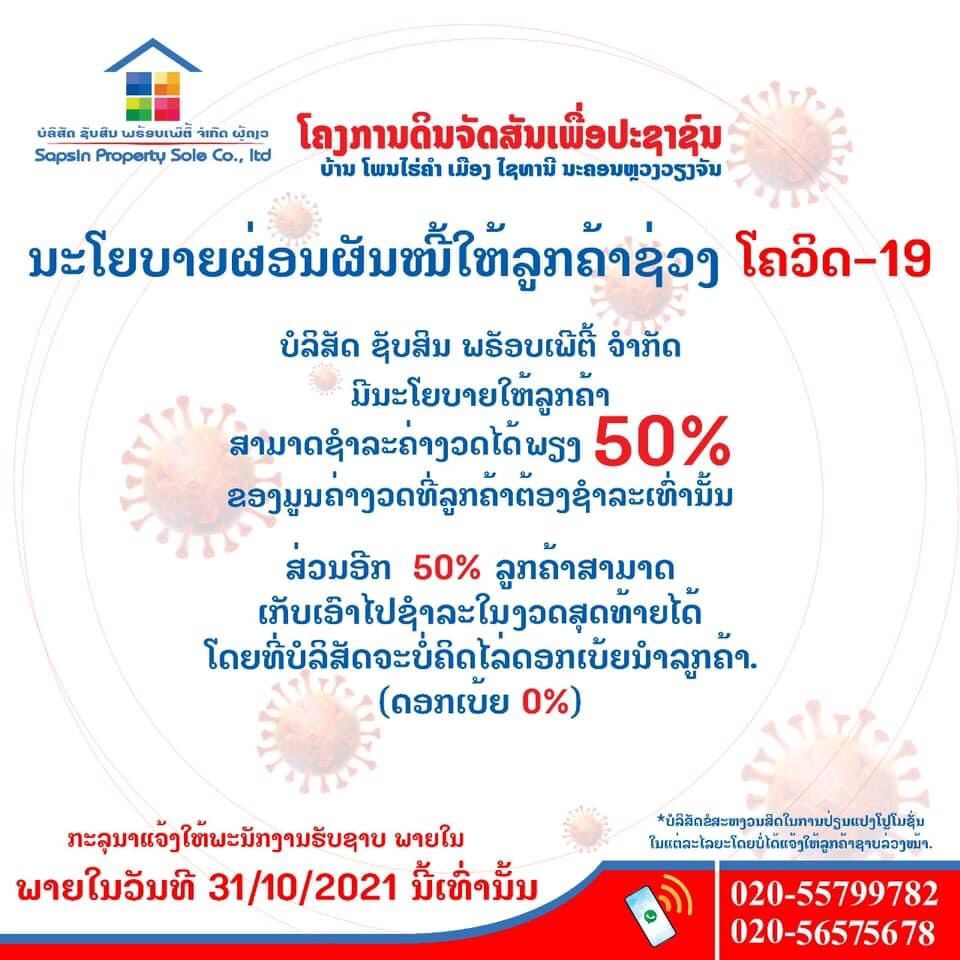 ຂ່າວດີສຳລັບຜູ້ທີ່ໄດ້ຮັບຜົນກະທົບຈາກໂຄວິດ-19 ທີ່ບໍ່ສາມາດຊໍາລະຄ່າງວດດິນໄດ້ຕາມປົກກະຕິບໍລິສັດ ຊັບສິນພຣັອບເພີຕີ້ ຈຳກັດ ມີນະໂຍບາຍໃຫ້ແກ່ລູກຄ້າຜູ້ທີ່ບໍ່ສາມາດຊໍາລະຄ່າງວດໄດ້ຕາມປົກກະຕິຄືລູກຄ້າສາມາດຊໍາລະຄ່າງວດໄດ້ພຽງ 50% ຂອງມູນຄ່າງວດທີ່ລູກຄ້າຕ້ອງຊໍາລະທົ່ານັ້ນ. ສ່ວນອີກ 50% ແມ່ນລູກຄ້າສາມາດເກັບເອົາໄປຊໍາລະໃນງວດສຸດທ້າຍໄດ້ໂດຍທີ່ບໍລິສັດຈະບໍ່ຄິດໄລ່ດອກເບ້ຍ.