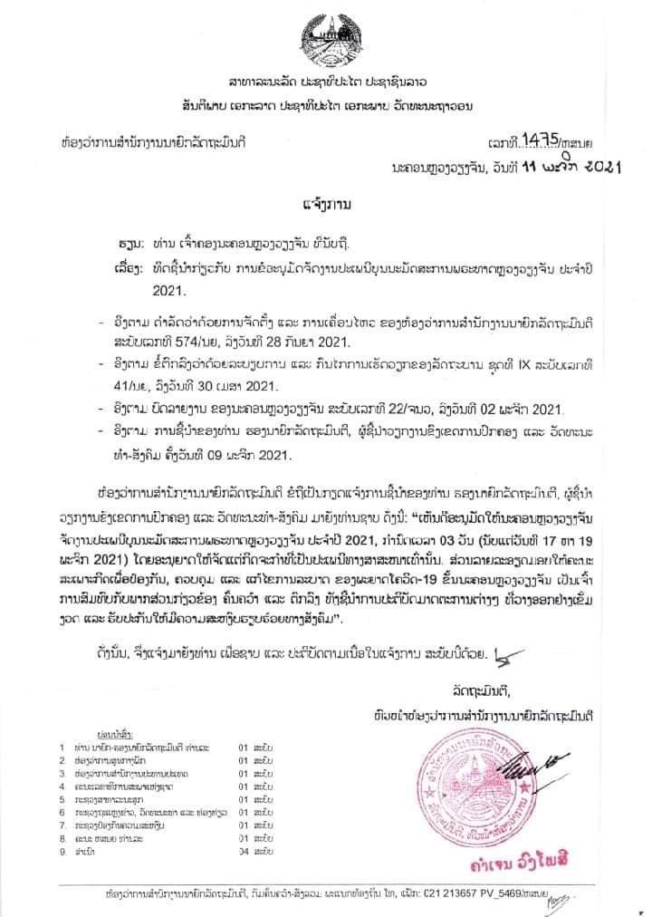 ເຫັນດີໃຫ້ຈັດງານບຸນນະມັດສະການພຣະທາດຫຼວງປະຈຳປີ ພ.ສ 2564 ຄ.ສ 2021 ລະຫວ່າງວັນທີ 17-19 ພະຈິກ 2021.
