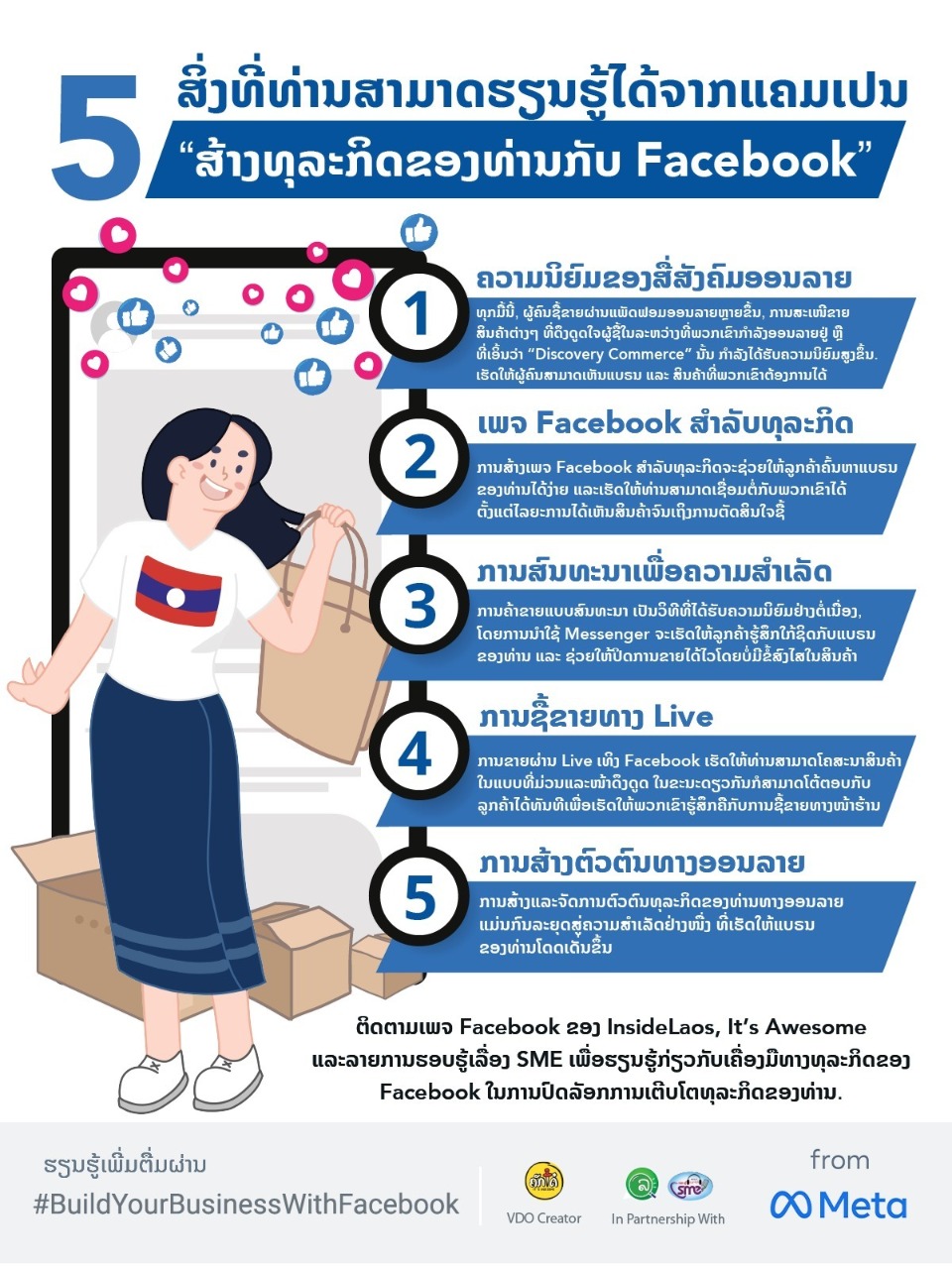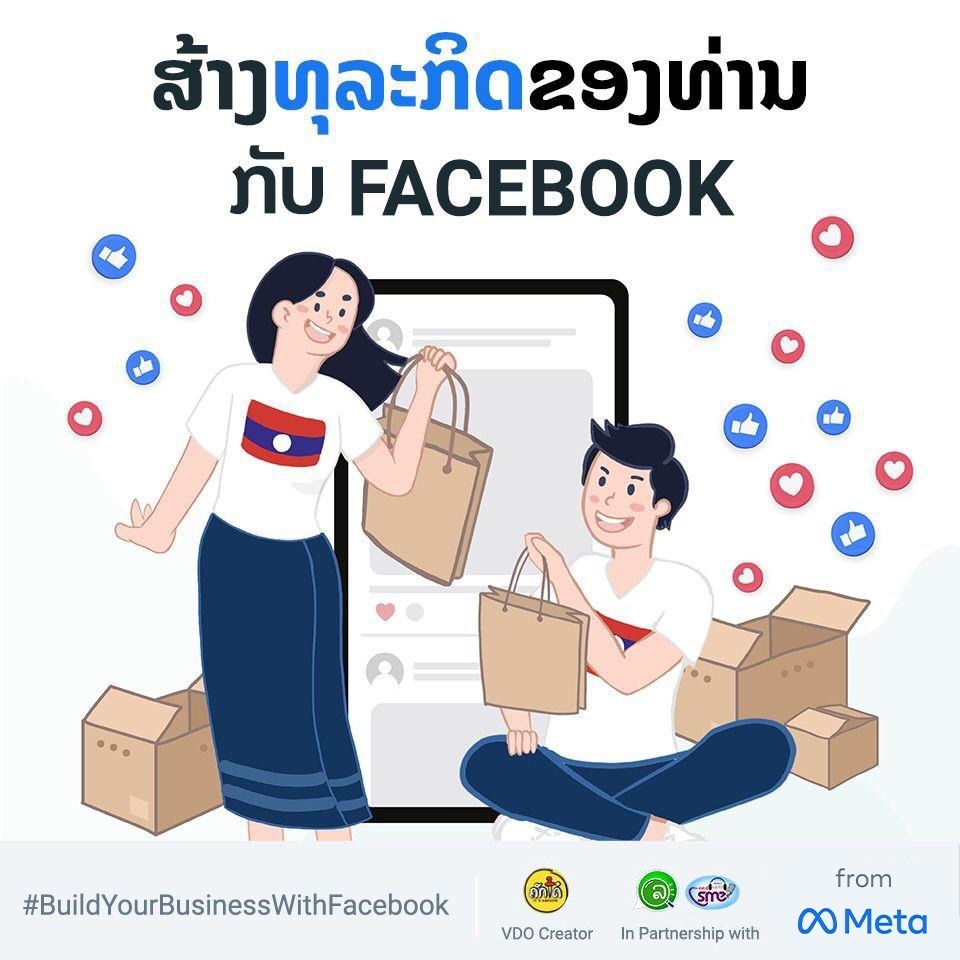 ມາປົດລັອກການເຕີບໂຕທາງທຸລະກິດຂອງທ່ານ ແລະຮຽນຮູ້ເພີ່ມຕື່ມກ່ຽວກັບແຄມເປນ “ສ້າງທຸລະກິດຂອງທ່ານກັບ Facebook” ຕັ້ງແຕ່ວັນທີ 16 ພະຈິກ ຫາ 16 ທັນວາ 2021 ດ້ວຍການຕິດຕາມເພຈ InsideLaos, It’s Awesome ແລະ ລາຍການຮອບຮູ້ເລື່ອງ SME ເທິງ Facebook ແລະຢ່າລືມແຊຣເພຈ Facebook ຂອງທ່ານເພື່ອໂປໂໝດຜະລິດຕະພັນ ແລະການບໍລິການກັບໝູ່ເພື່ອນຂອງທ່ານຜ່ານ Hashtag #ສ້າງທຸລະກິດຂອງທ່ານກັບ Facebook
