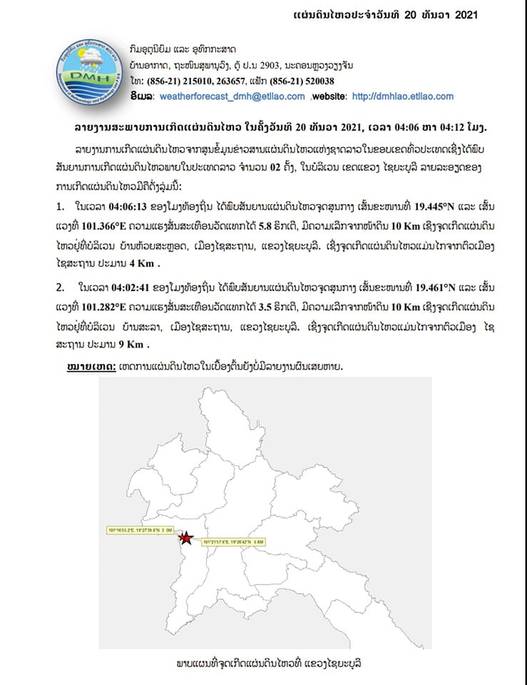 ກົມອຸຕຸນິຍົມ ແລະອຸທົກກະສາດລາຍງານສະພາບການເກີດແຜ່ນດິນໄຫວໃນຄັ້ງວັນທີ 20 ທັນວາ 2021 ເວລາ 04:06 ຫາ 04:12 ໂມງ.