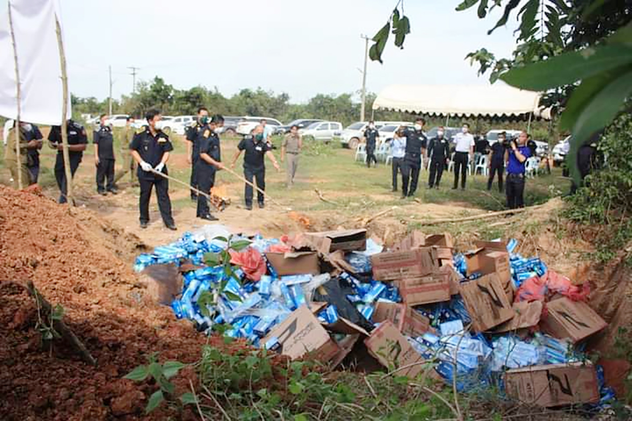 ເຈົ້າຫນ້າທີ່ ທໍາລາຍຢາສູບ ແລະເຄື່ອງສໍາອາງ 100 ກວ່າແກັດ ທີ່ລັກລອບນໍາເຂົ້າ