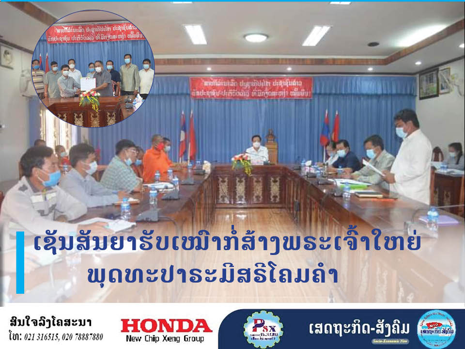 ພິທີເຊັນສັນຍາຮັບເໝົາກໍ່ສ້າງພະເຈົ້າໃຫຍ່ ພຸດທະປາຣະ ມີສຣີໂຄມຄຳລະຫວ່າງອົງການປົກຄອງເມືອງຕົ້ນເຜິ້ງ ແຂວງບໍ່ແກ້ວ ແລະນາຍຊ່າງຜູ້ຮັບເໝົາ ໄດ້ຈັດຂຶ້ນໃນວັນທີ 17 ສິງຫາ 2021 ຢູ່ຫ້ອງວ່າການເມືອງ ເຂົ້າຮ່ວມຝ່າຍສົງມີ ພຣະປຣີຊາສຸວັນ ນະໂຄມຄຳທັມມາຈານ ພຣະອາຈານ ສົມສັກ ທິບພະ