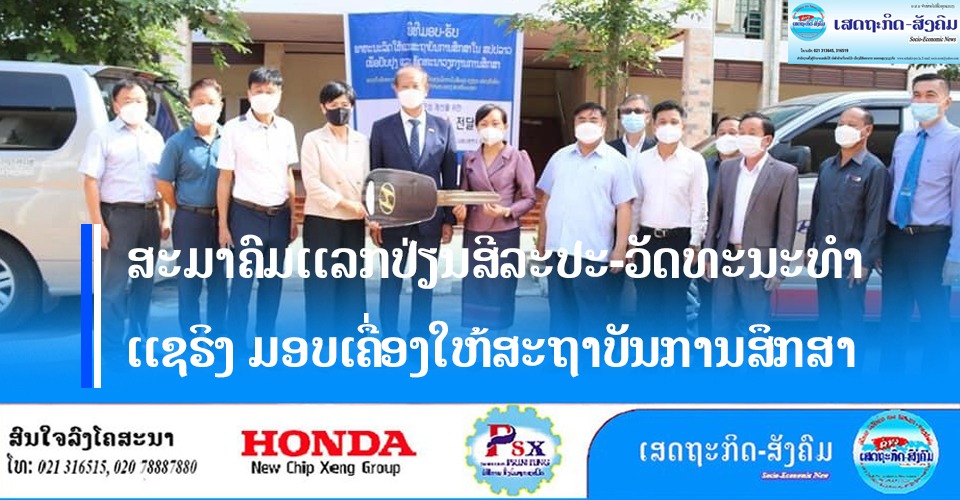 ພິທີມອບຮັບພາຫະນະ ແລະອຸປະກອນຈາກສະມາຄົມແລກ ປ່ຽນສີລະປະ ແລະວັດທະນະທໍາ ແຊຣິງ ສ. ເກົາຫຼີ ໄດ້ຈັດຂຶ້ນໃນວັນທີ 9 ສິງຫາ 2021 ທີ່ສະຖາບັນພັດທະນາສີມືແຮງງານລາວ-ເກົາຫຼີ ໂດຍເປັນກຽດເຂົ້າຮ່ວມຂອງທ່ານ ນາງ ໃບຄຳ ຂັດທິຍະລັດຖະມົນຕີກະຊວງແຮງງານ ແລະສະຫວັດດີການ