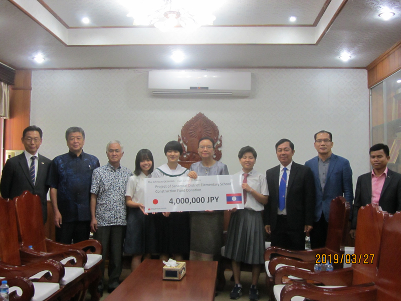ບັນດານັກຮຽນຈາກມັດທະຍົມ 3 ແຫ່ງ, ຮ່ວມກັບຜູ້ປະສານ ງານຂອງພວກເຂົາຈາກແຂວງໂອກິນະວະ,ປະເທດຍີ່ປຸ່ນໄດ້ເຂົ້າຢ້ຽມຄຳນັບທ່ານ ນາງ ແສງເດືອນ ຫຼ້າ ຈັນທະບູນລັດຖະມົນຕີກະຊວງສຶກສາທິການ ແລະກີລາໃນວັນທີ 27 ມີນາ 2019, ພວກເຂົາໄດ້ຈັດຕັ້ງກິດຈະກຳລະດົມທຶນຊ່ວຍເຫຼືອໃຫ້ປະ ຊາ