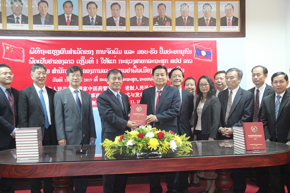 ພິທີມອບ-ຮັບປຶ້ມປະທານຸກົມພືດເປັນຢາຂອງລາວເຫຼັ້ມ 1 ໃຫ້ກະຊວງສາທາລະນະສຸກໂດຍສໍານັກງານຄຸ້ມຄອງການແພດ-ການຢາພື້ນເມືອງ ສປ ຈີນ ໄດ້ຈັດຂຶ້ນວັນ ທີ 18 ພະຈິກ 2019 ທີ່ກະຊວງສາທາລະນະສຸກຮ່ວມລົງນາມມອບ-ຮັບ