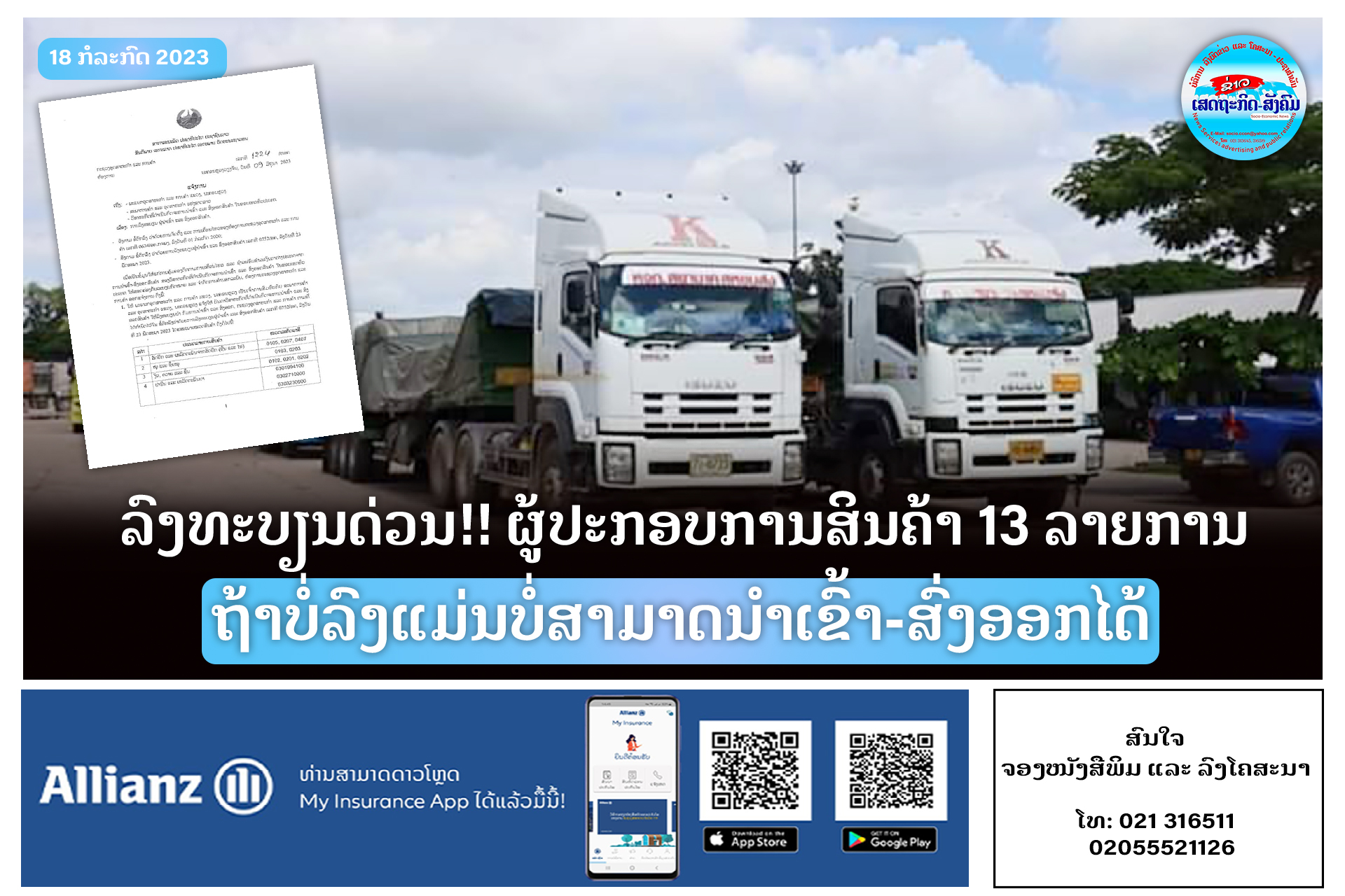 ກະຊວງອຸດສາຫະກໍາ ແລະການຄ້າ ໄດ້ອອກແຈ້ງການ ສະບັບເລກທີ 1224/ຫອຄ, ລົງວັນທີ 09 ມິຖຸນາ 2023 ກ່ຽວກັບການລົງທະບຽນຜູ້ນຳເຂົ້າ ແລະ ສົ່ງອອກສິນຄ້າໃນຂອບເຂດທົ່ວປະເທດ ໂດຍສະເພາະ 13 ໝວດສິນຄ້າທີ່ລະບຸໄວ້ໃນແຈ້ງການ.
