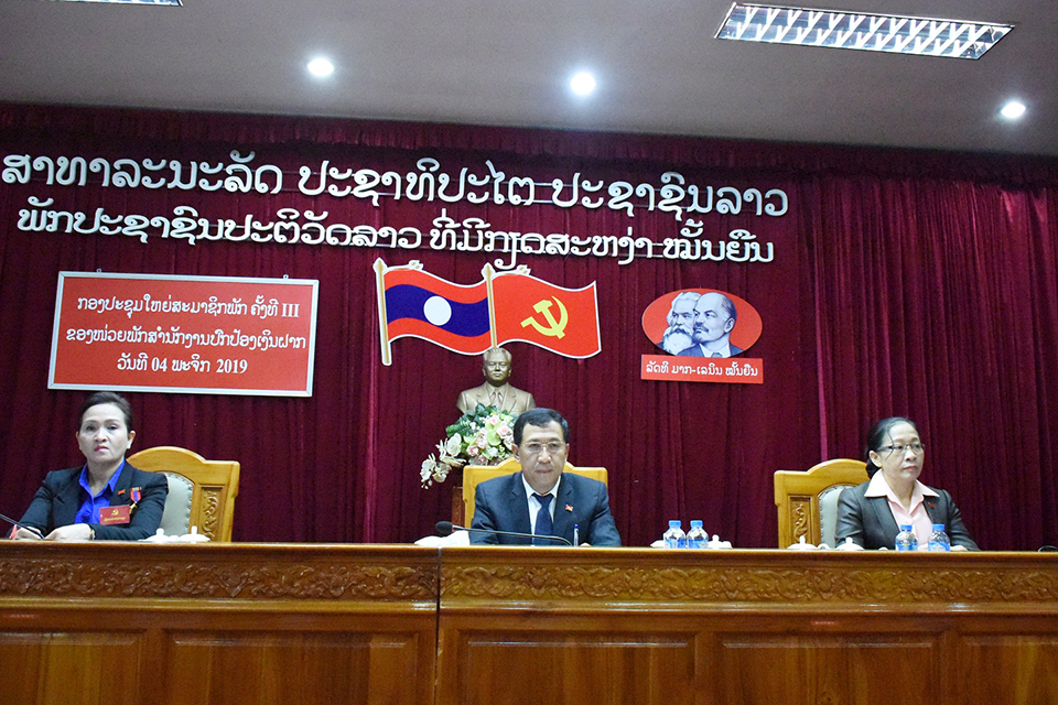 ກອງປະຊຸມໃຫຍ່ສະມາຊິກພັກຄັ້ງທີກອງປະຊຸມໃຫຍ່ສະມາຊິກພັກຄັ້ງທີ III ຂອງໜ່ວຍພັກສໍານັກງານປົກປ້ອງເງິນຝາກ (ສປງ) ທະນາຄານແຫ່ງ ສປປ ລາວ (ທຫລ) ໄດ້ສໍາເລັດລົງໃນວັນທີ 4 ພະຈິກ 2019 ທີ່ຫ້ອງປະຊຸມໃຫຍ່ ທຫລ, ນະຄອນຫຼວງວຽງຈັນ