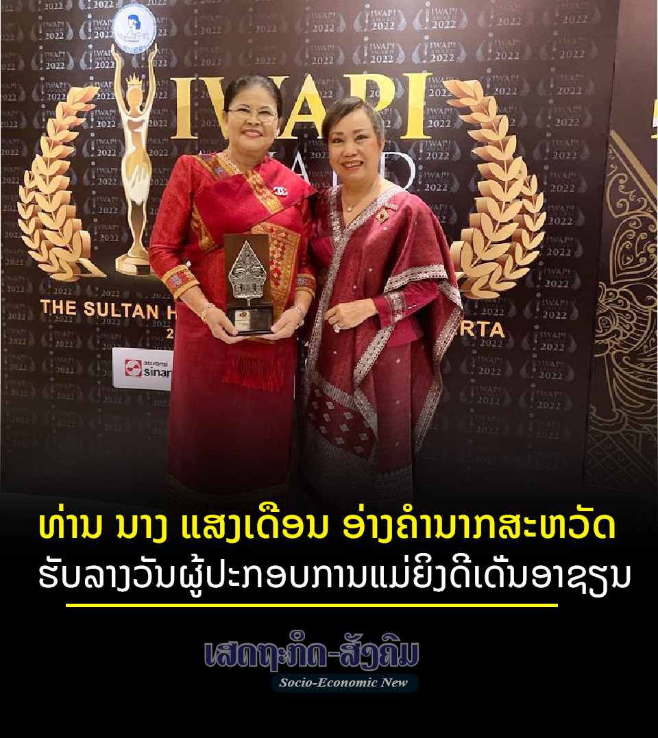 ຖືເປັນລາງວັນອັນມີຄຸນຄ່າ ແລະເປັນລາງວັນທີ່ປະສົບຜົນສຳເລັດບາດກ້າວສຳຄັນໃນການພັດທະນາທຸລະກິດຂອງບໍລິສັດ ກຸ່ມແສງອ່າງຄຳຈຳກັດຜູ້ດຽວ ແລະໂຮງແຮມອ່າງຄຳ ທີ່ຖືກຄັດເລືອກໄດ້ຮັບລາງວັນຜູ້ປະກອບການແມ່ຍິງດີເດັ່ນອາຊຽນປະຈຳປີ 2022.