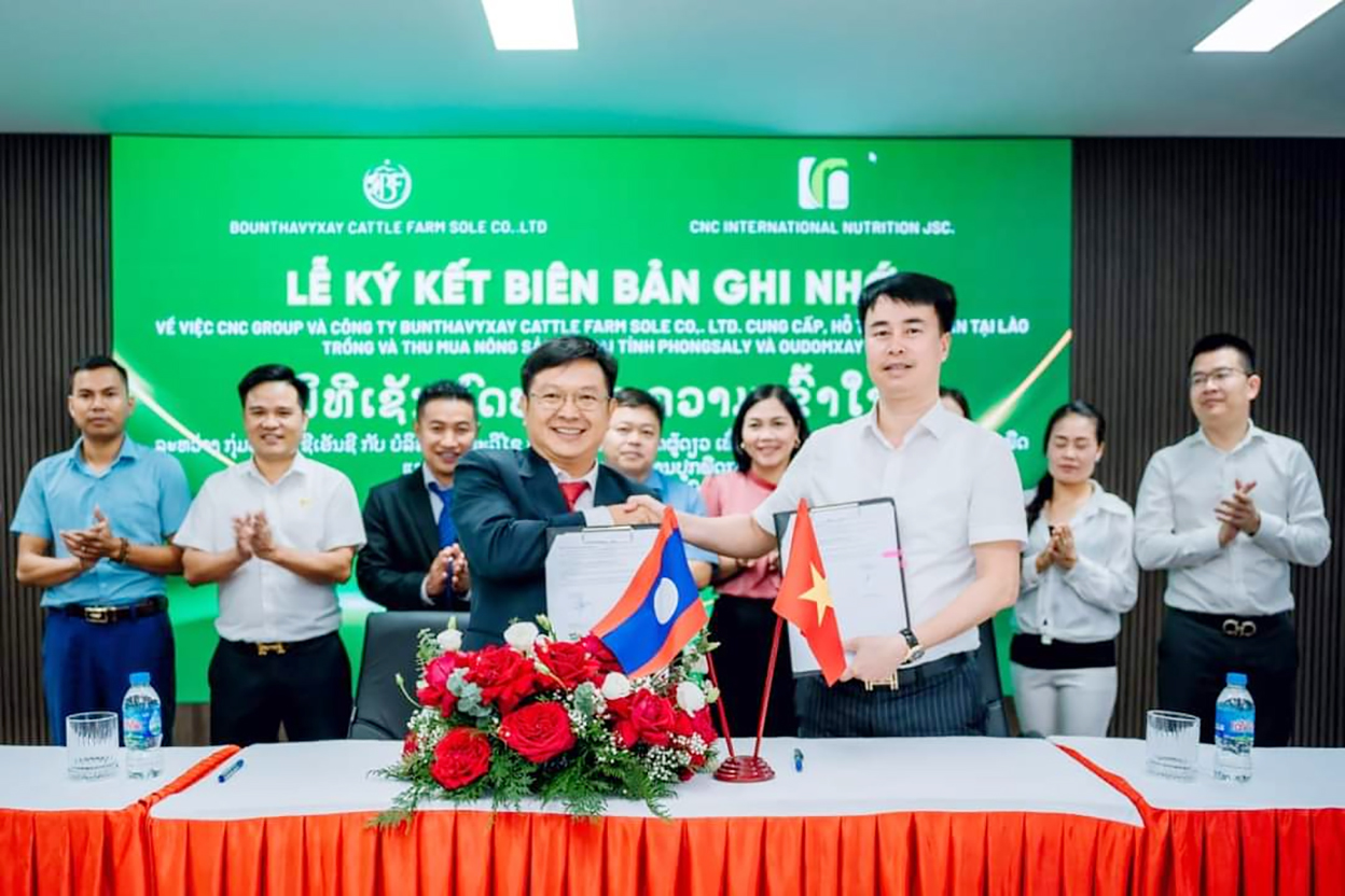 ພິທີເຊັນບົດບັນທຶກຄວາມເຂົ້າໃຈການຮ່ວມມືເພື່ອສົ່ງເສີມຊາວກະສິກອນ ແລະເກັບຊື້ຄືນຜົນຜະລິດຈາກການປູກພືດກະສິກຳທີ່ແຂວງຜົ້ງສາລີ ແລະອຸດົມໄຊ ລະຫ່ວາງ ບໍລິສັດຫຸ້ນສ່ວນດ້ານໂພຊະນາການສາກົນ CNC ຂອງ ສສ ຫວຽດນາມ ກັບ ບໍລິສັດ ບຸນທະວິໄຊຟາມລ້ຽງສັດ ຈຳກັດຜູ້ດຽວ ສປປ ລາວ